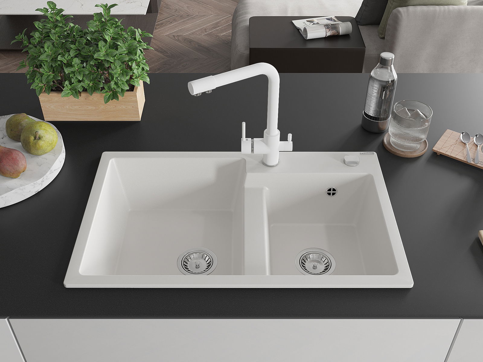 Drez má predfrézovaný otvor s priemerom 35 mm na samostatné prerazenie. Môže sa využiť napríklad na montáž dávkovača na tekutinu, ktorý eliminuje prítomnosť plastových fliaš v kuchyni a pridáva jej elegantné dokončenie.