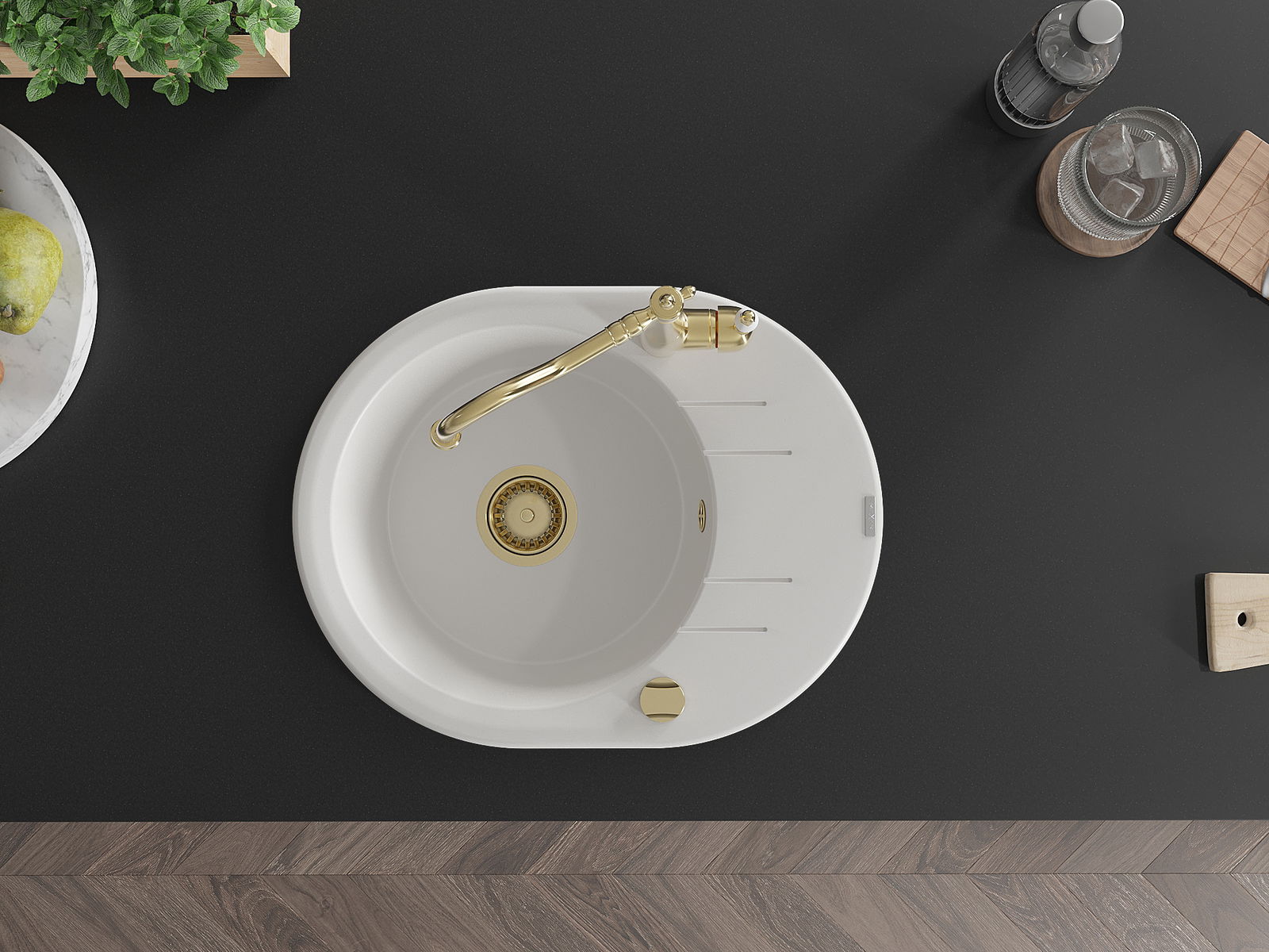Mexen Kevin žulový drevený drez s 1 najmenej komorou s odkvapkávačom a kuchynskou batériou Carla, biela - 6517-20-670700-50
