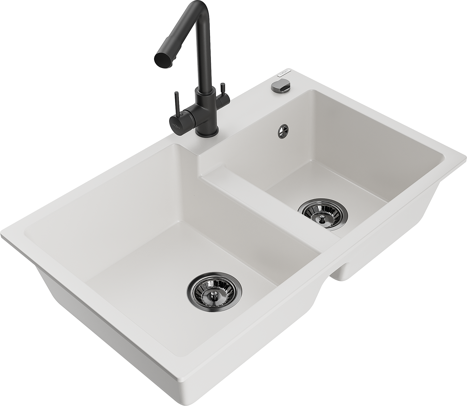 Mexen Tomas dvojkomorový žulový drez s kuchynskou batériou Duero, biela - 6516-20-671600-70