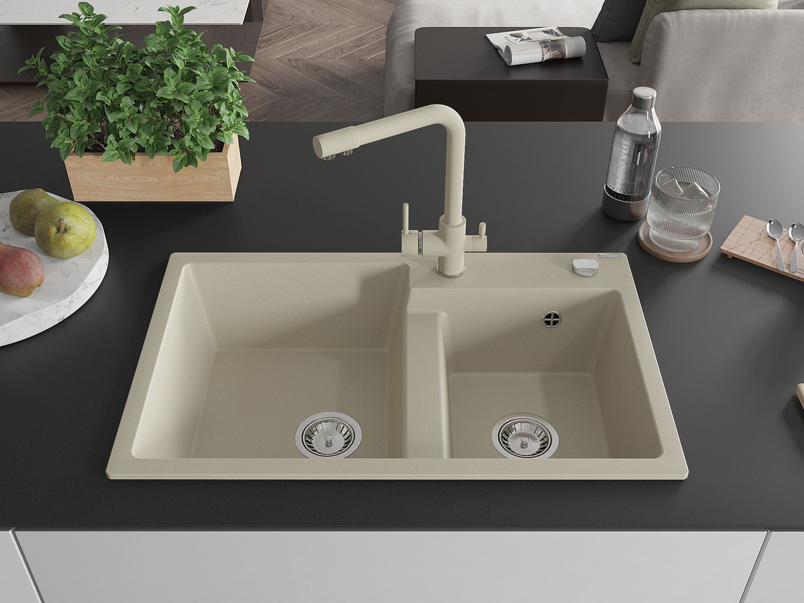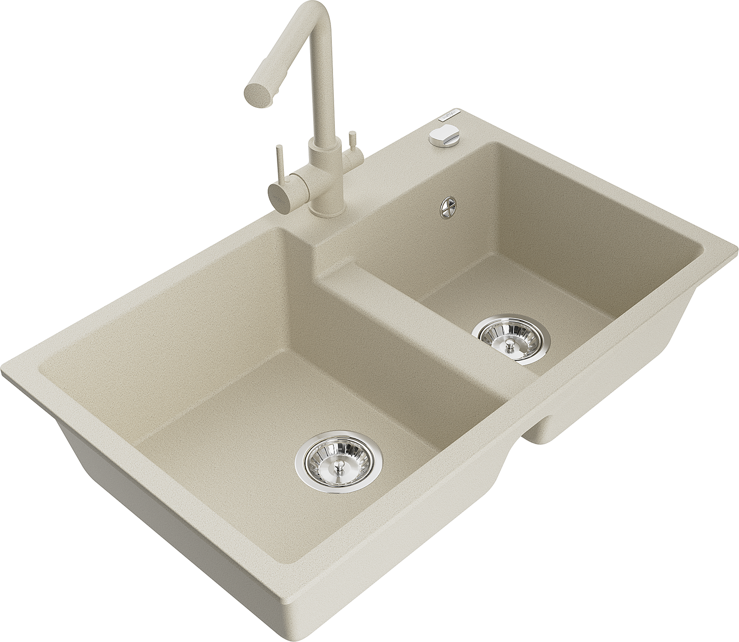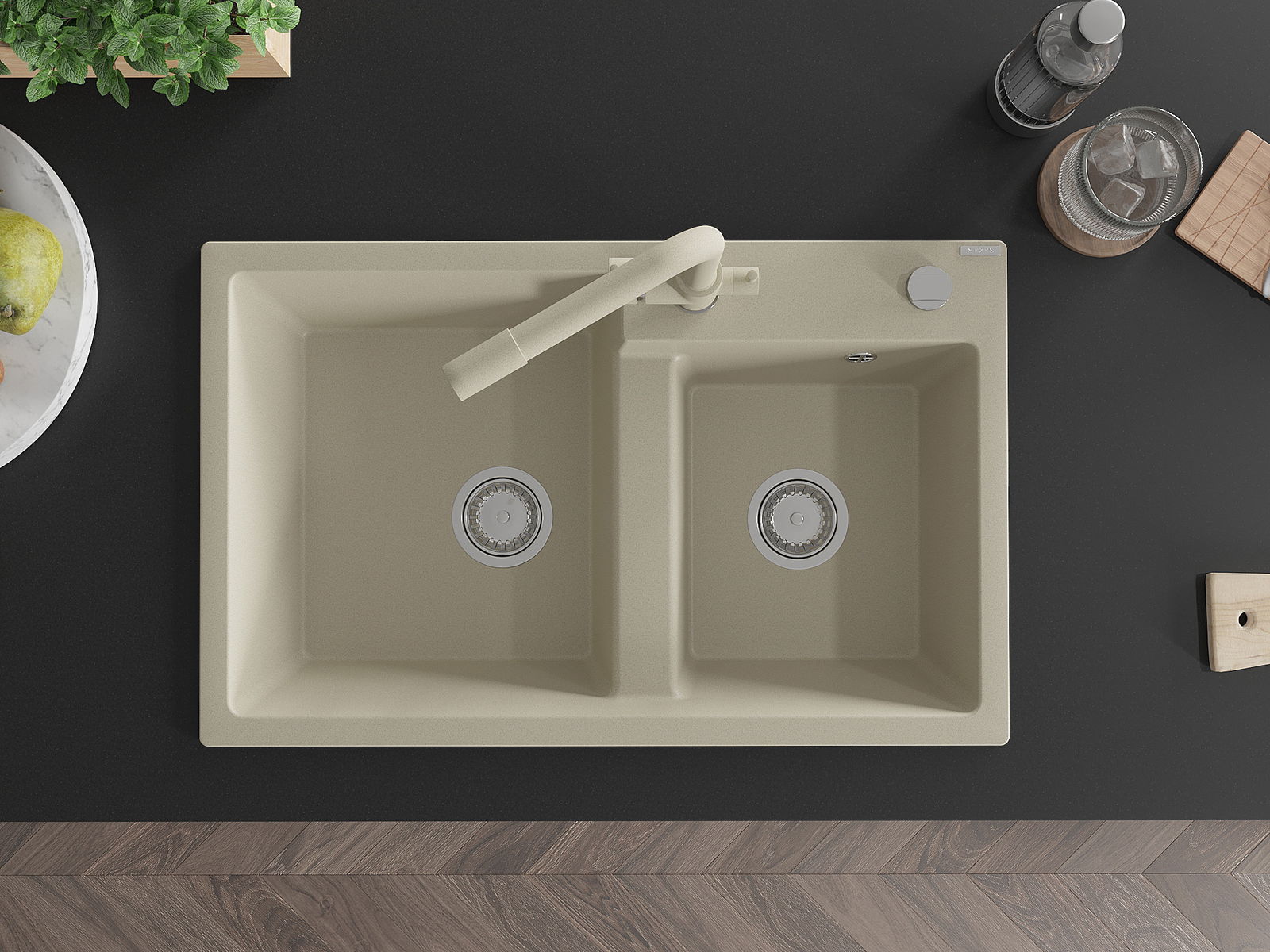 Mexen Tomas žulový dvojkomorový drez s kuchynskou batériou Duero, béžový - 6516-69-671600-69