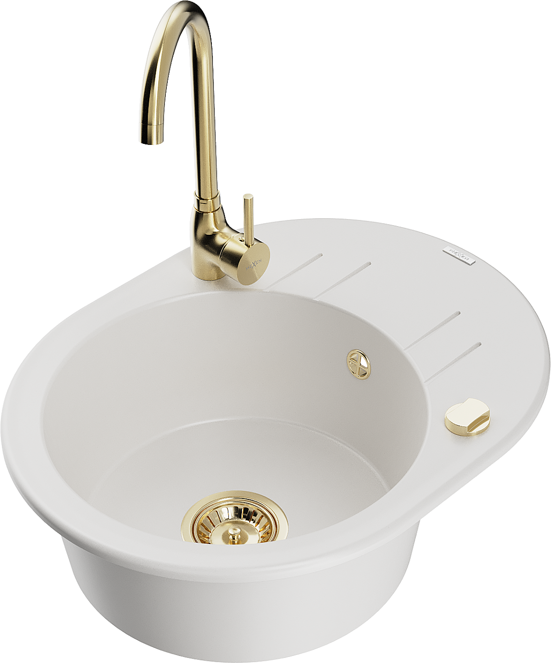 Mexen Kevin granitový kuchynský drez 1-komorový s odkvapkávačom a kuchynskou batériou Telma, biely - 6517-20-670200-50