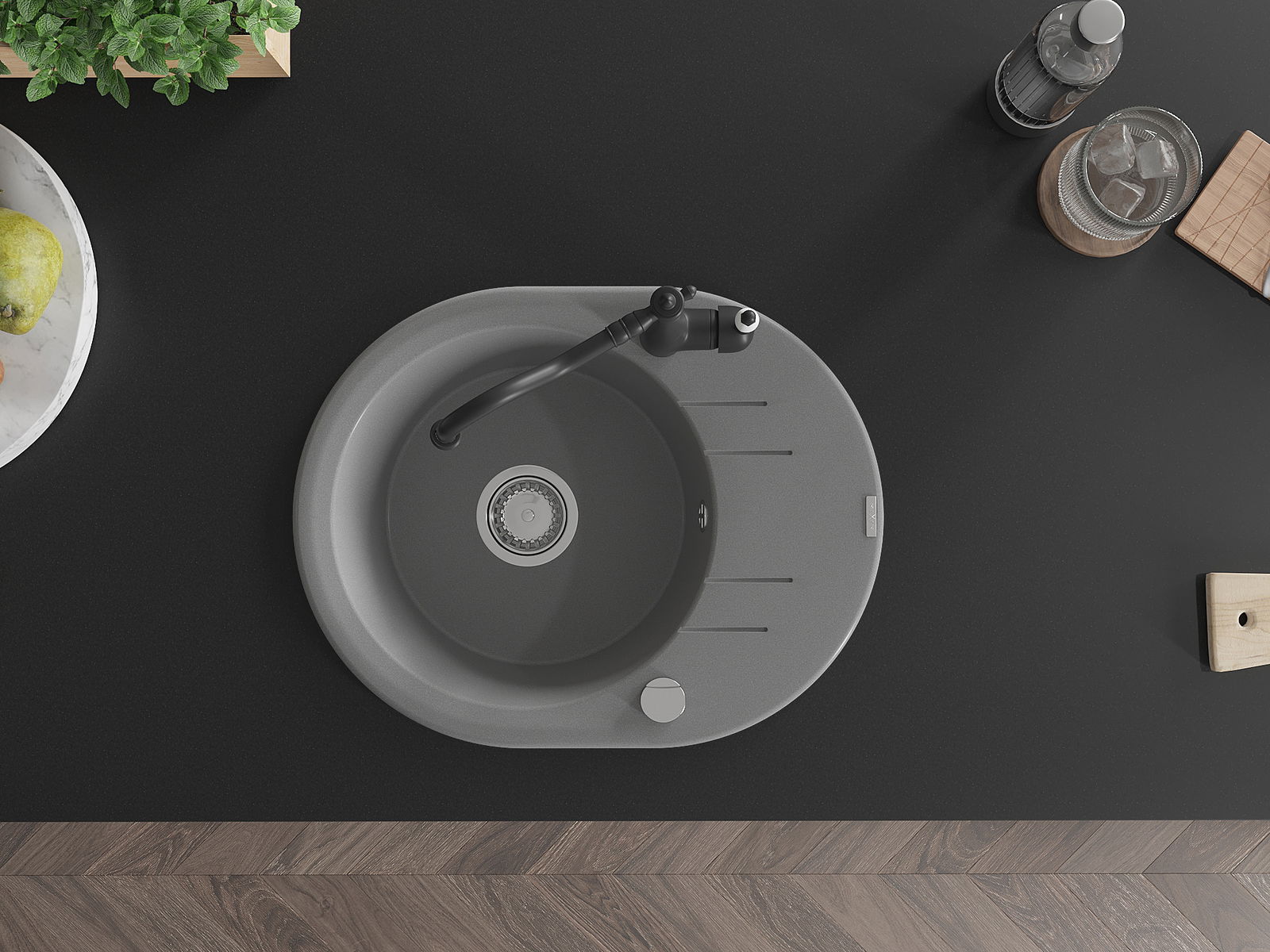 Mexen Kevin žulový kuchynský drez 1-komorový s odkvapom a kuchynskou batériou Carla, sivý - 6517-71-670700-70