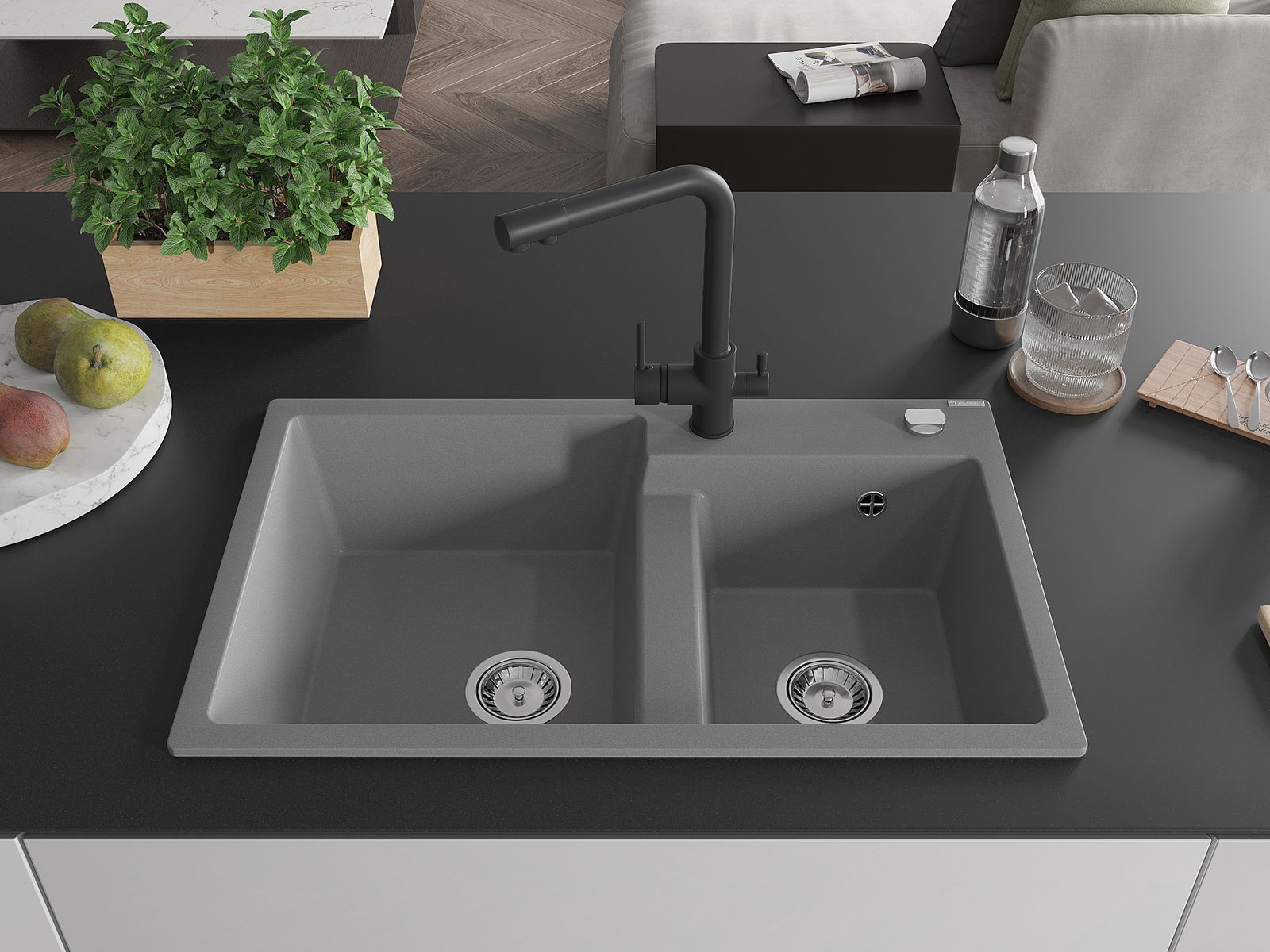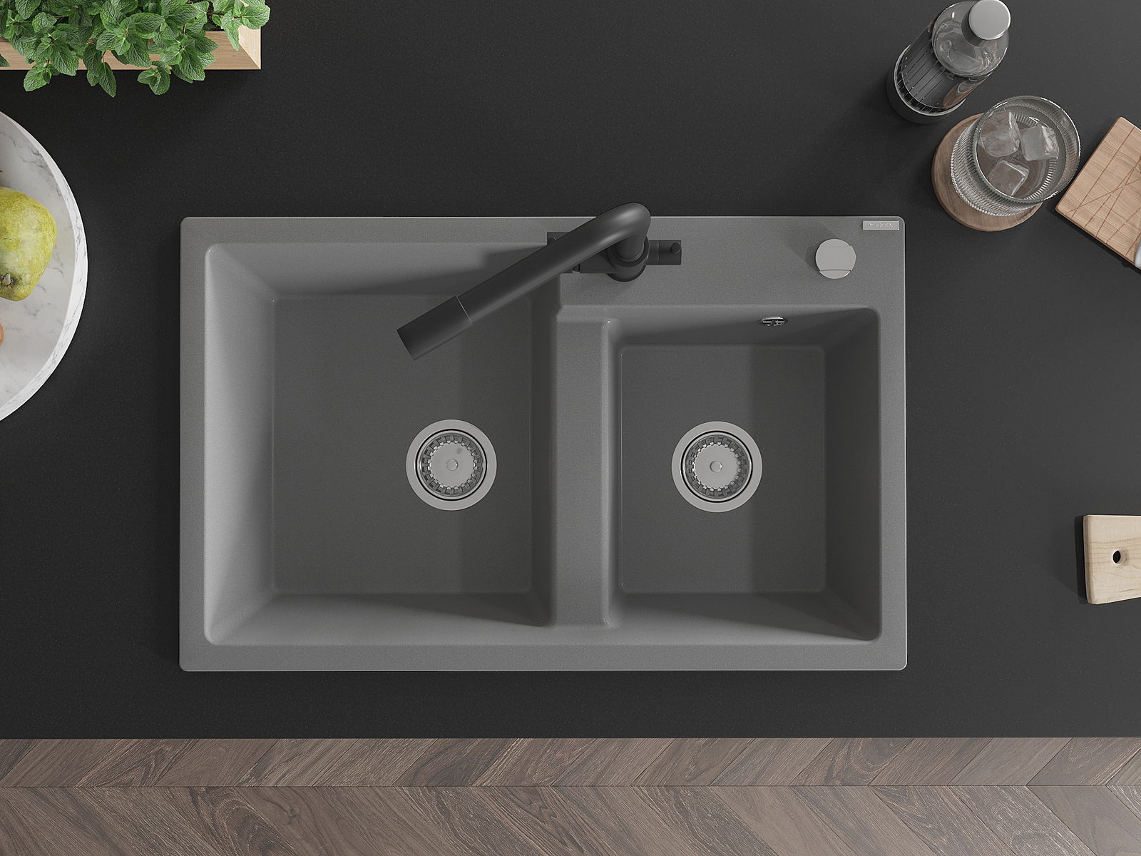 Mexen Tomas žulový drez, 2-komorový s kuchynskou batériou Duero, sivý - 6516-71-671600-70