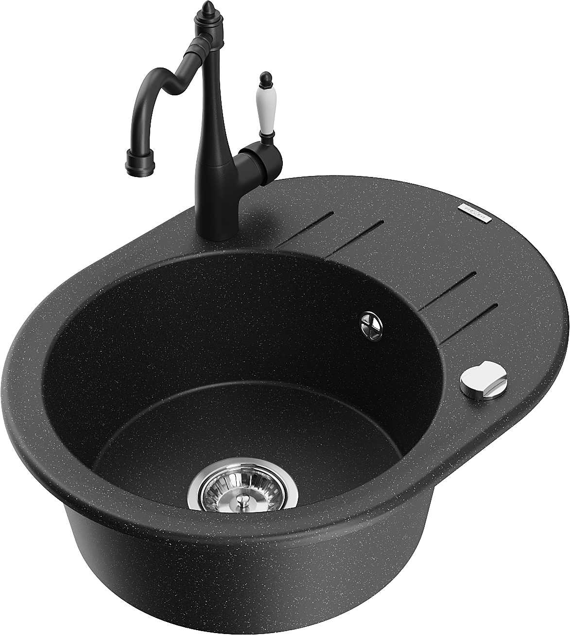 Mexen Kevin granitový drez s 1 komorou, odkvapom a kuchynskou batériou Carla, čierny/strieborný metalik - 6517-73-670700-70