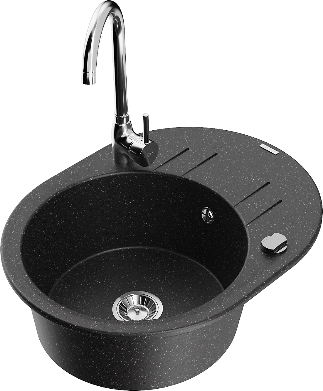 Mexen Kevin granitový kuchynský drez s jednou komorou a odkvapkávačom a kuchynskou batériou Telma, čierny/strieborný