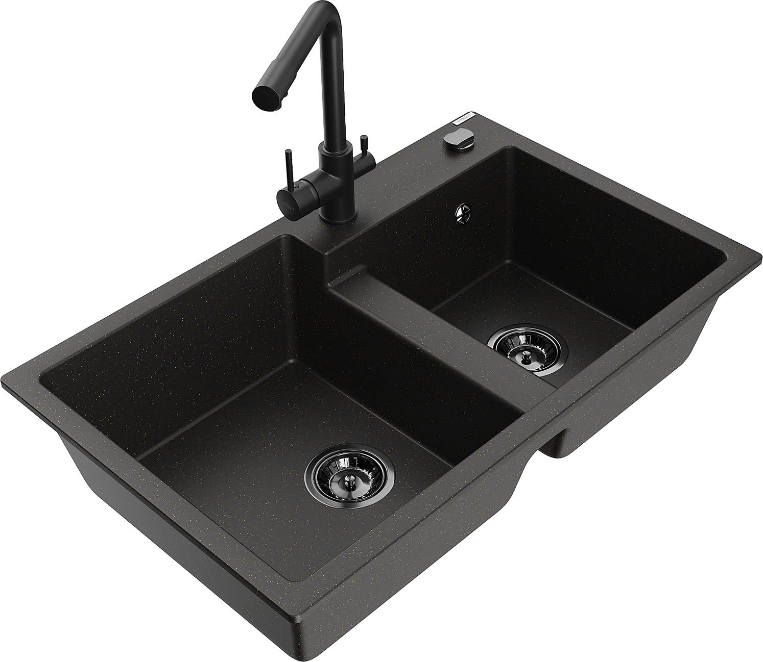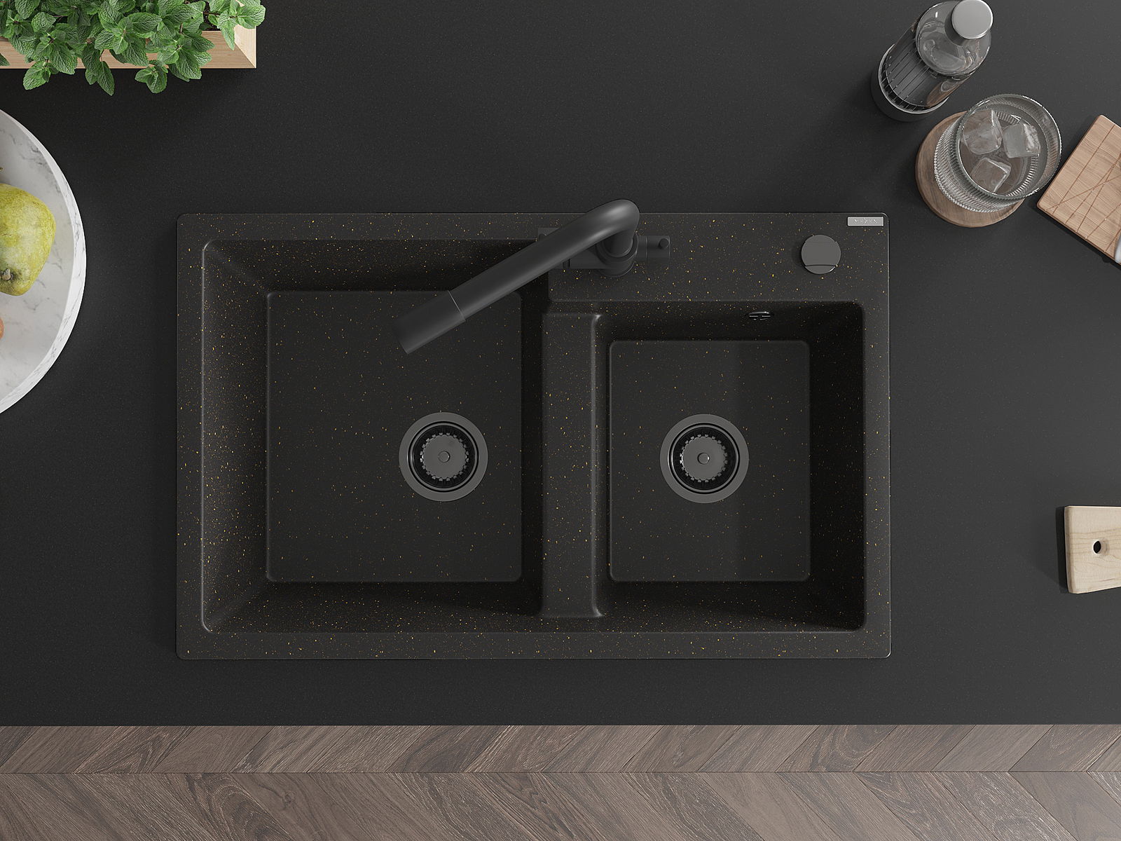 Mexen Tomas žulový drez s 2 komorami a kuchynskou batériou Duero, čierny/zlatý metalik - 6516-75-671600-70-B
