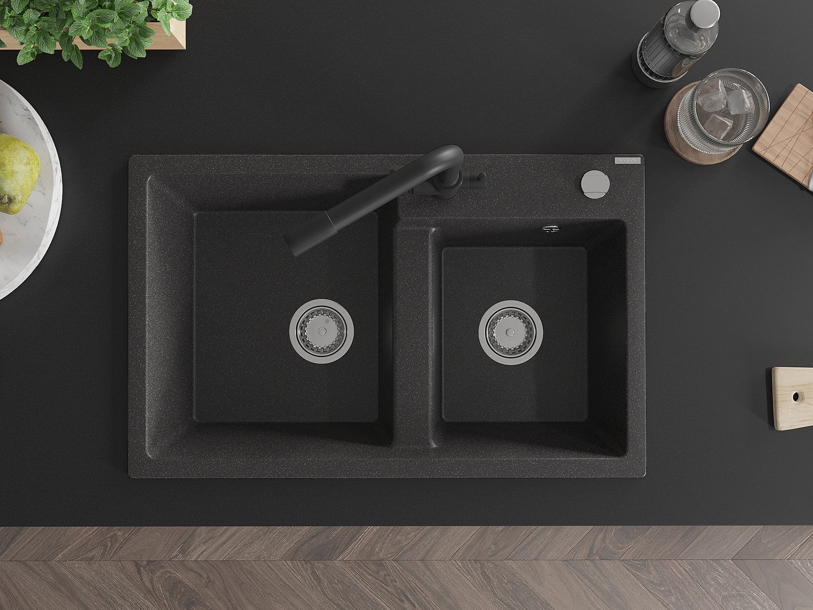 Mexen Tomas granitový kuchynský drez 2-komorový s kuchynskou batériou Duero, čierny s fľakmi - 6516-76-671600-70