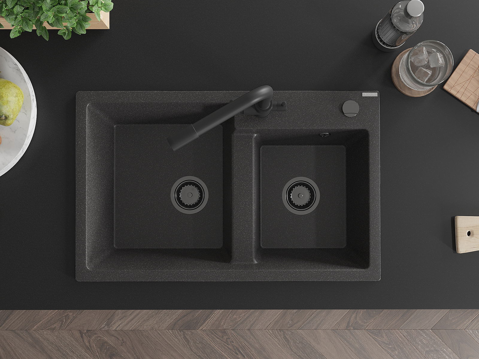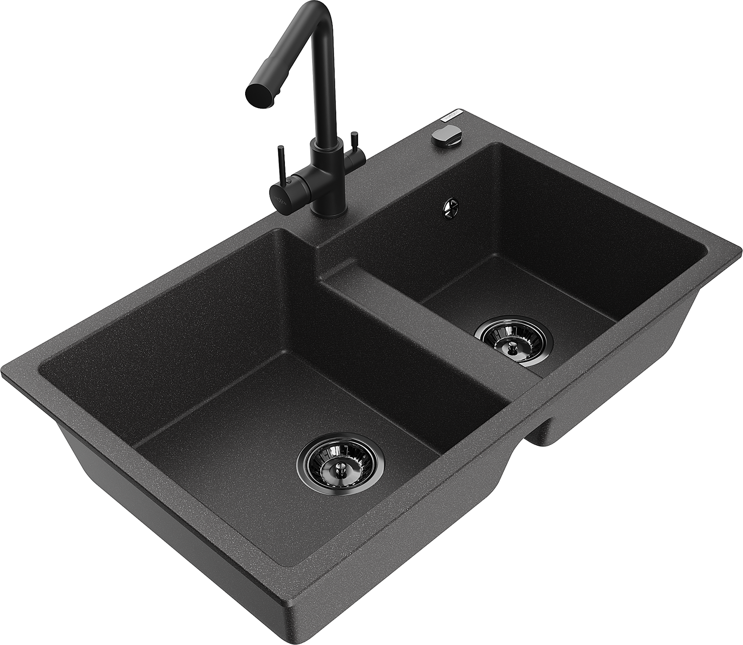 Mexen Tomas žulový dvojkomorový drez s kuchynskou batériou Duero, čiernobiely bodkovaný - 6516-76-671600-70-B
