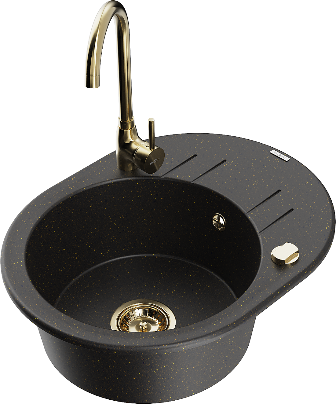 Mexen Kevin jednokomorový žulový drez s odkvapkávačom a kuchynskou batériou Telma, čierny/zlatý metalik - 6517-75-670200-50