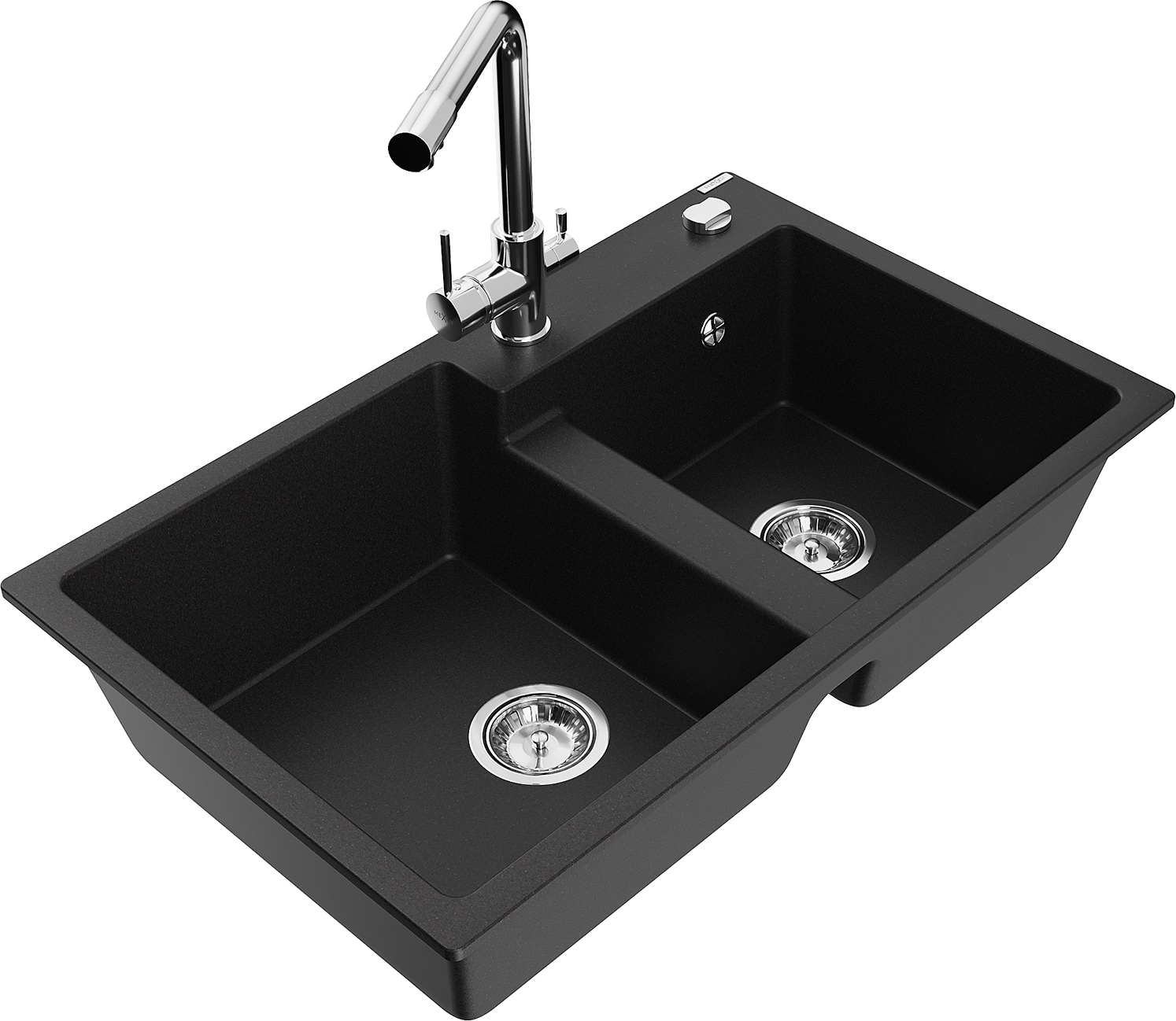 Mexen Tomas žulový drez s 2 komorami s kuchynskou batériou Duero, čierny - 6516-77-671600-00