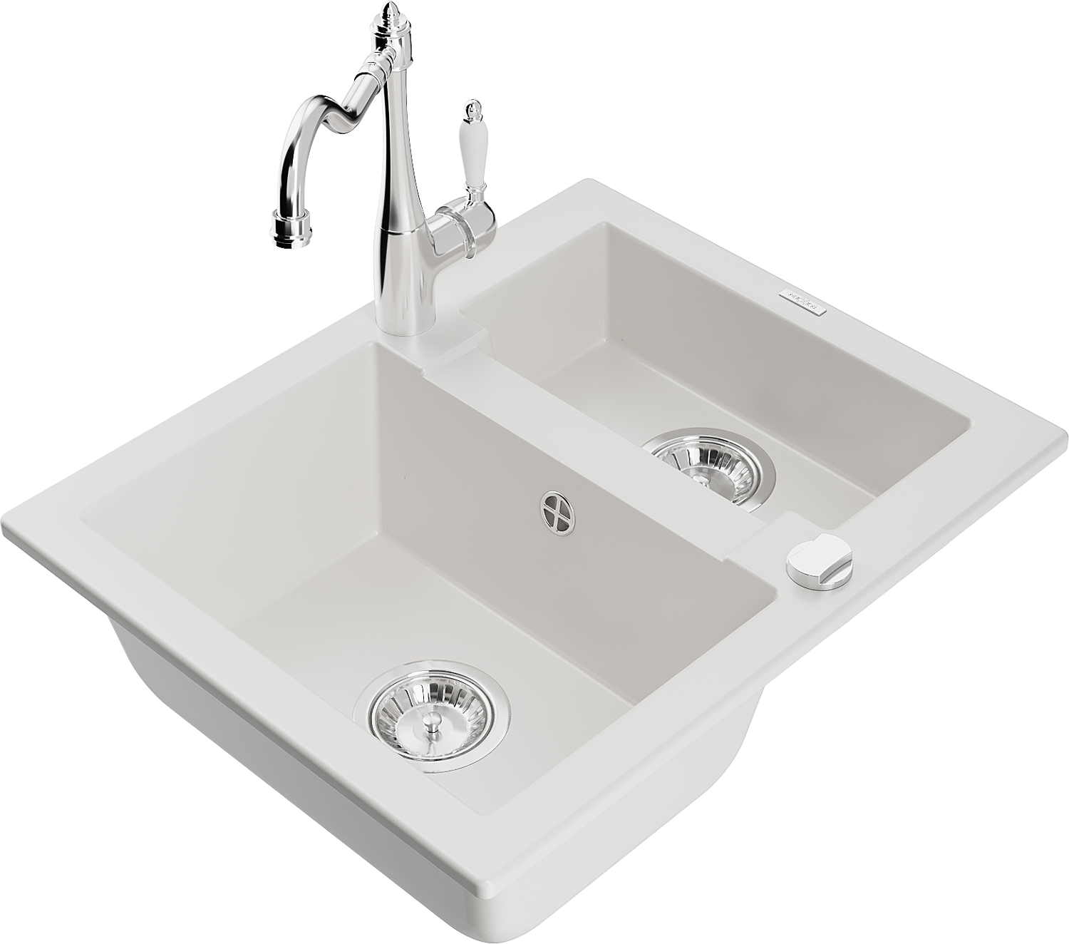 Mexen Carlos granitový kuchynský drez 1,5-komorový s kuchynskou batériou Carla, biely - 6518-20-670700-00