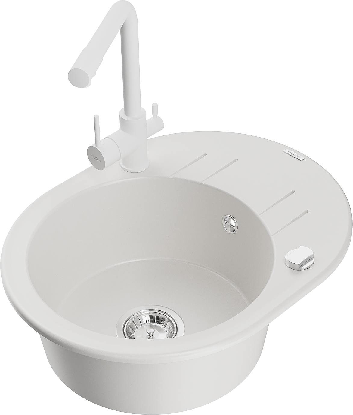 Mexen Kevin granitový drez 1-komorový s odkvapkávačom a kuchynskou batériou Duero, biely - 6517-20-671600-20