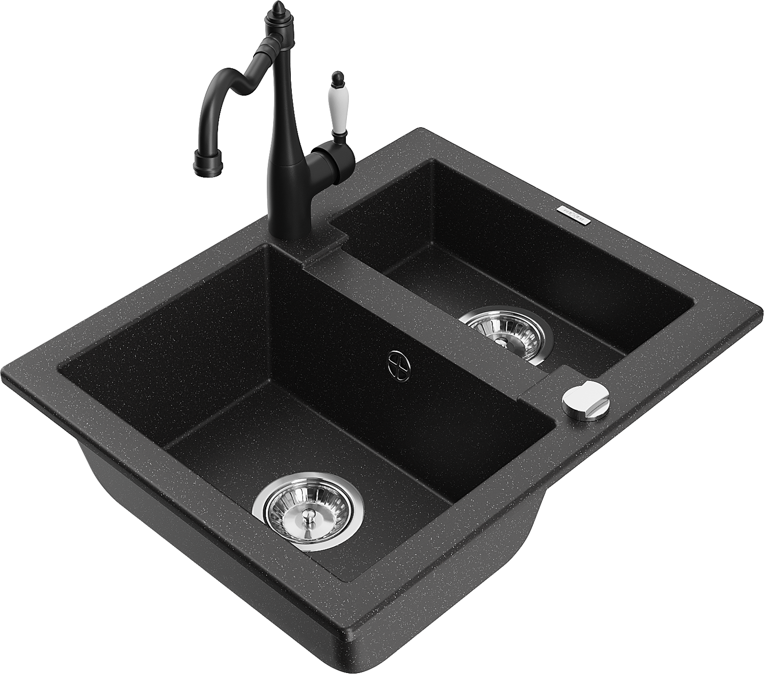 Mexen Carlos žulový drez 1,5-komorový s kuchynskou batériou Carla, čierna/strieborný metalik - 6518-73-670700-70