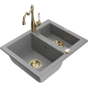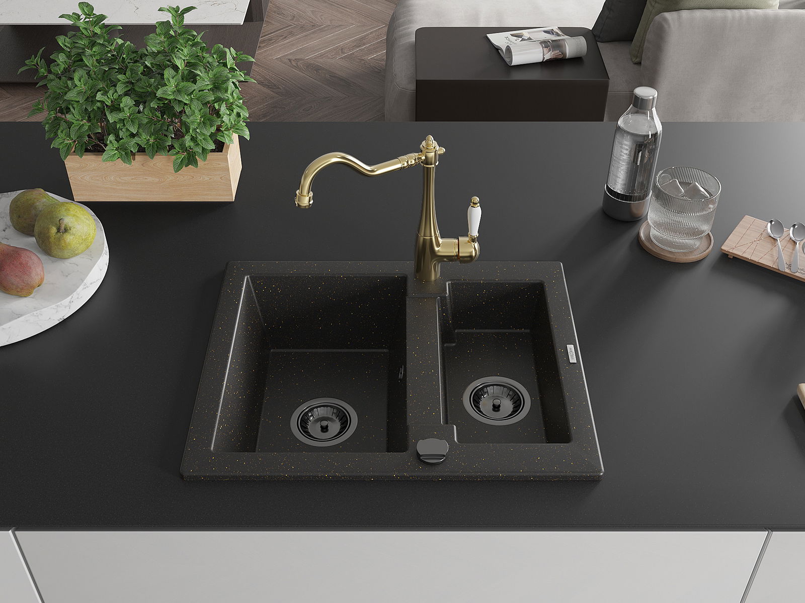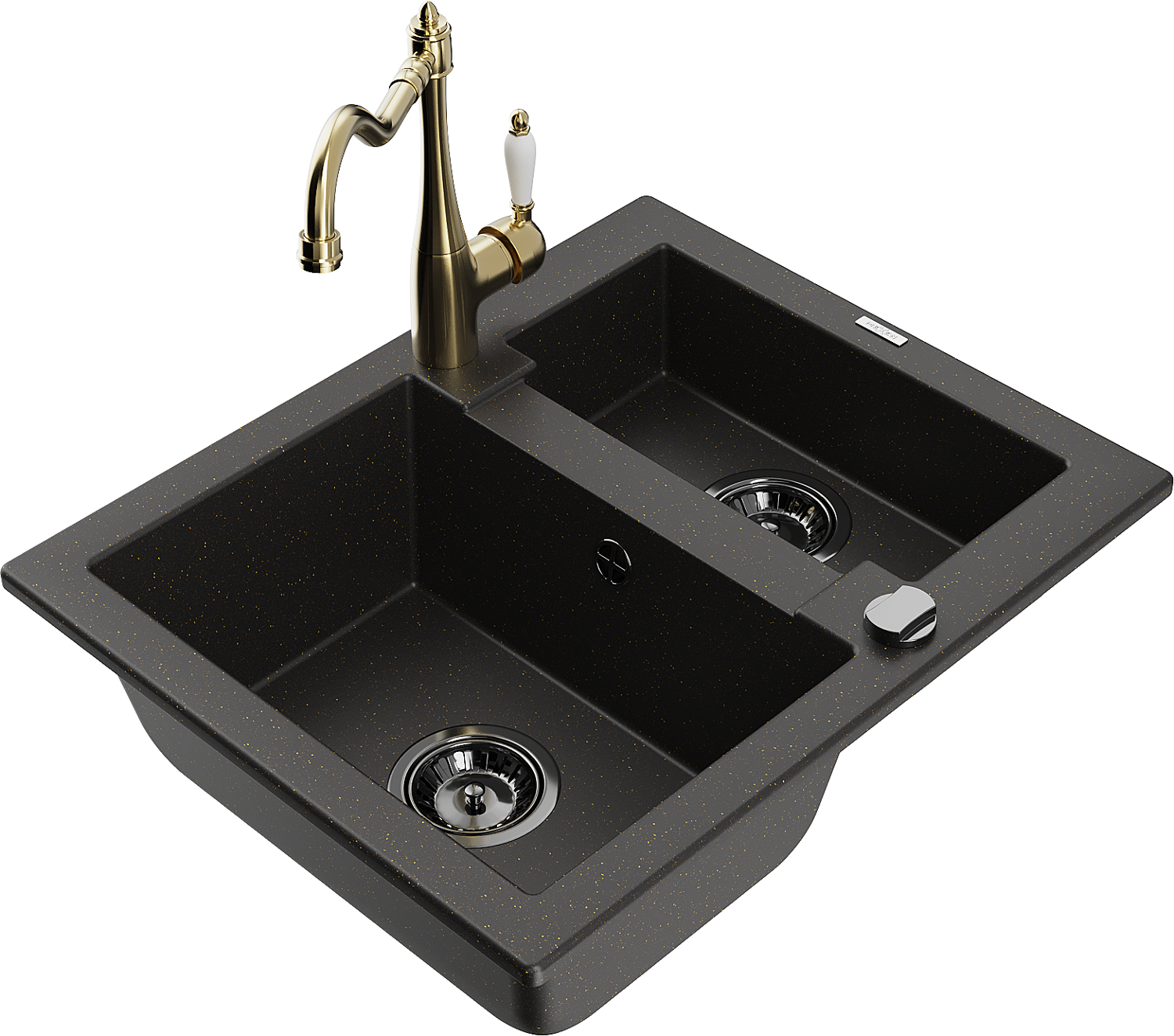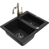 Mexen Carlos granitový kuchynský drez s 1,5 komorou a kuchynskou batériou Carla, čierny/zlatý metalik - 6518-75-670700-50-B