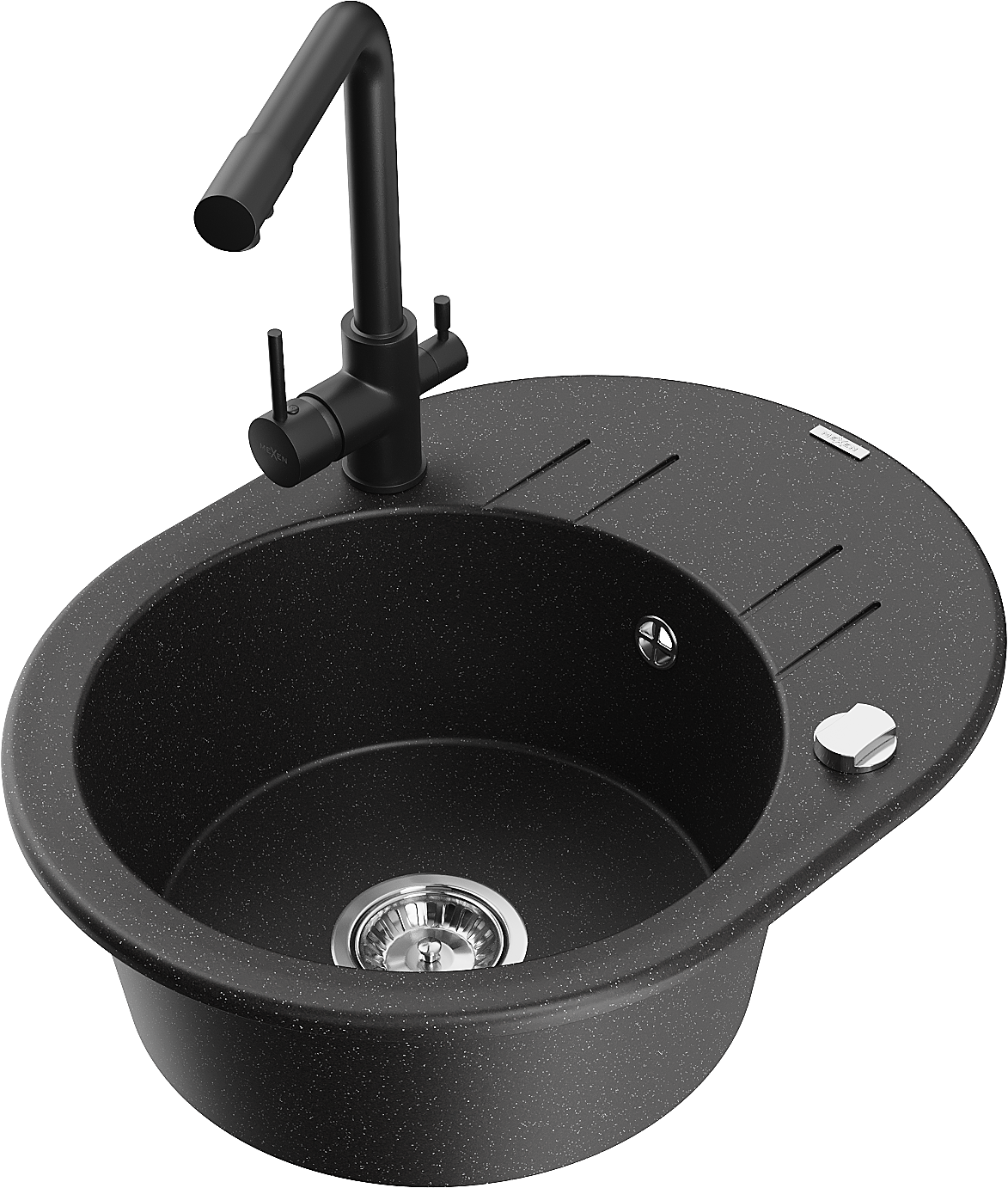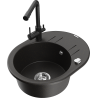 Mexen Kevin granitový drez 1-komorový s odkvapkávačom a kuchynskou batériou Duero, čierny/strieborný metalický