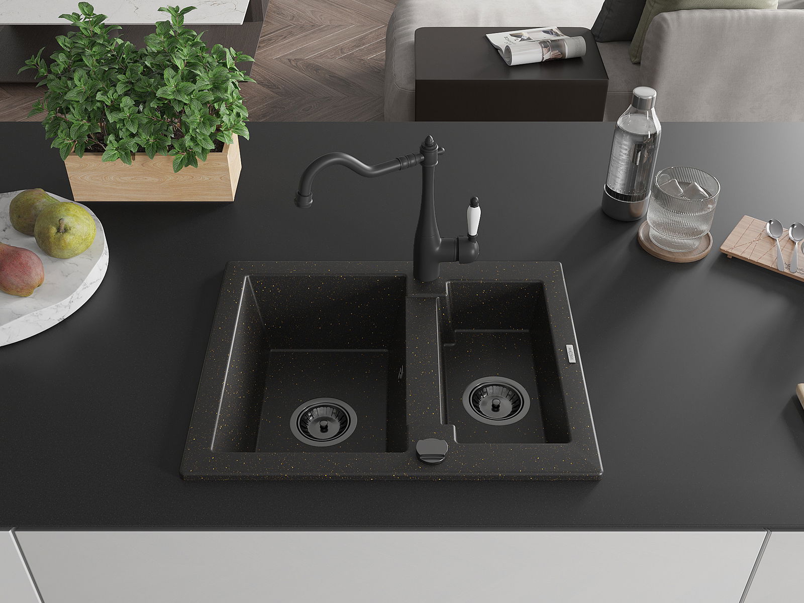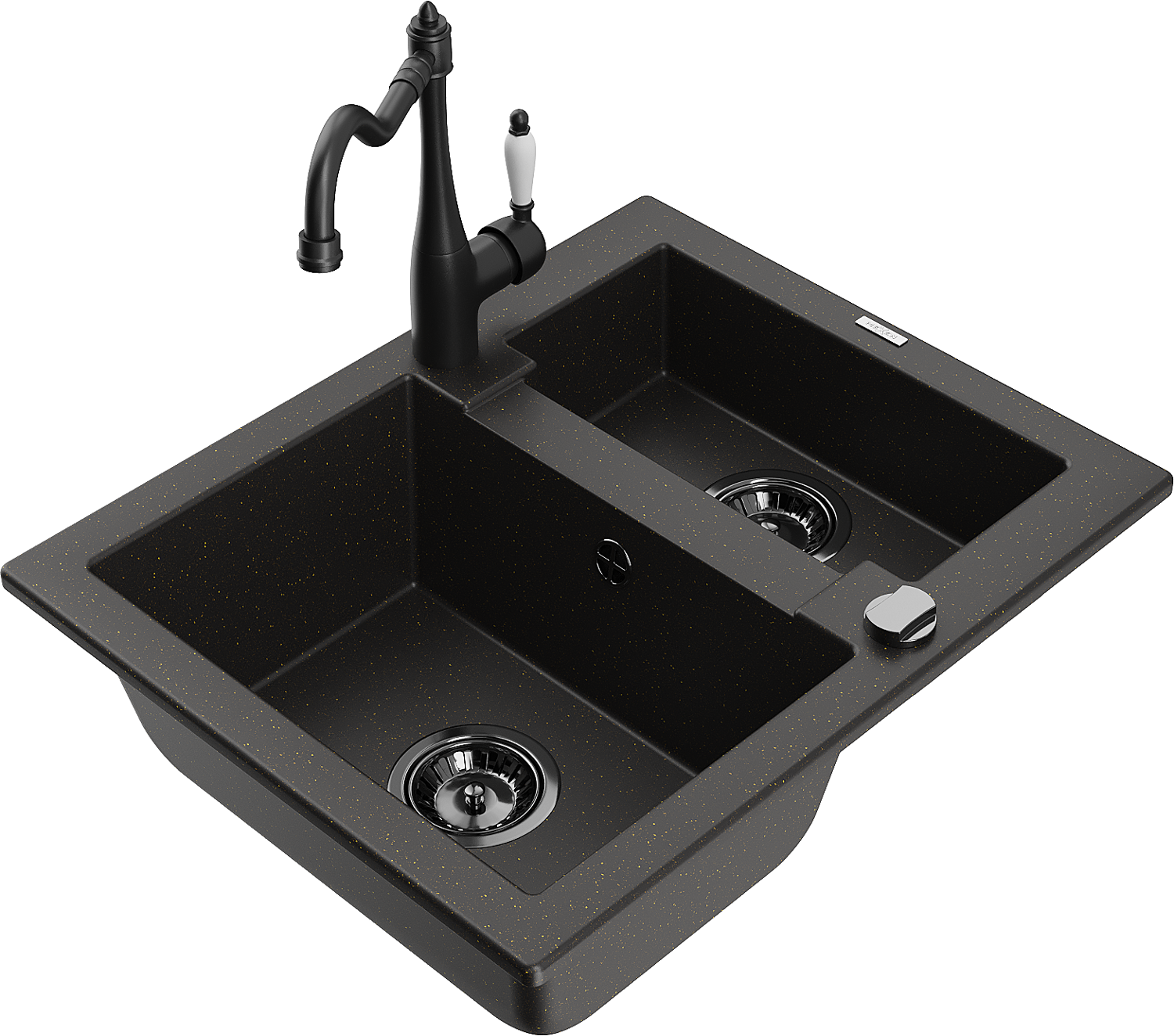 Mexen Carlos žulový drez s 1,5 komorou s kuchynskou batériou Carla, čierny/zlatý metalik - 6518-75-670700-70-B