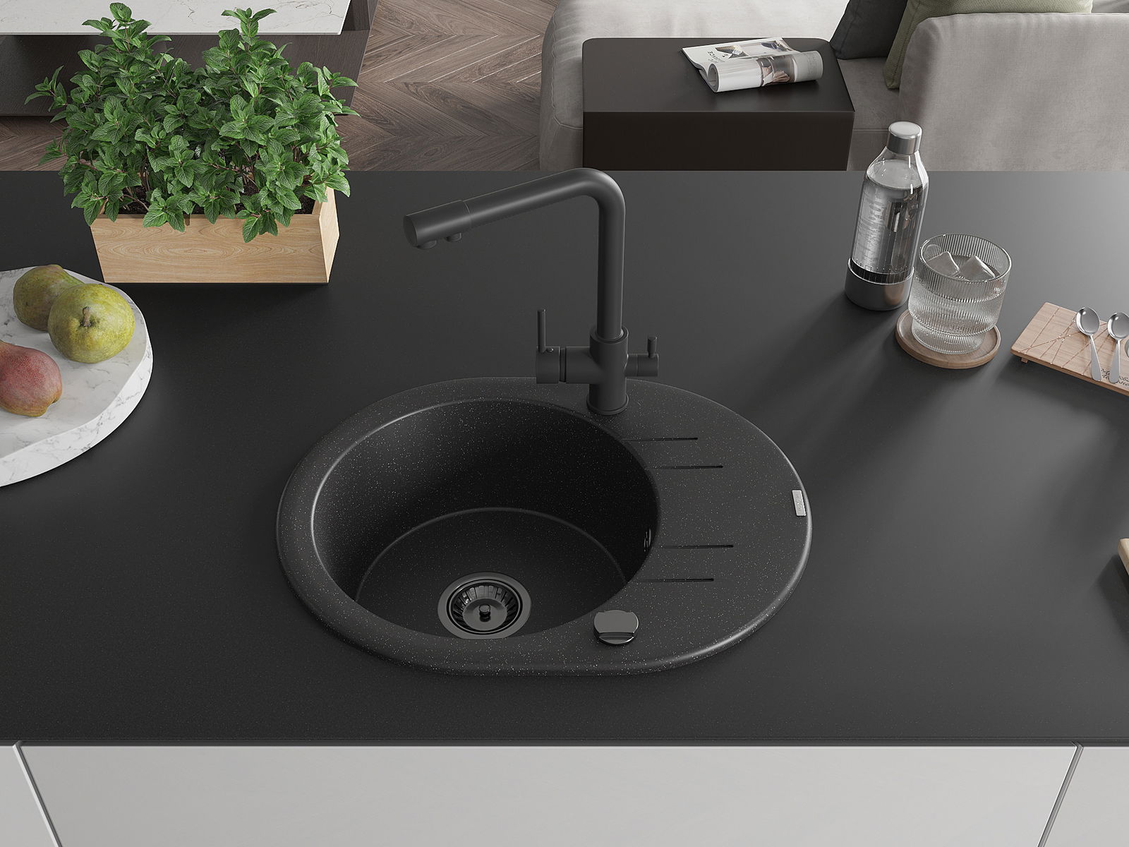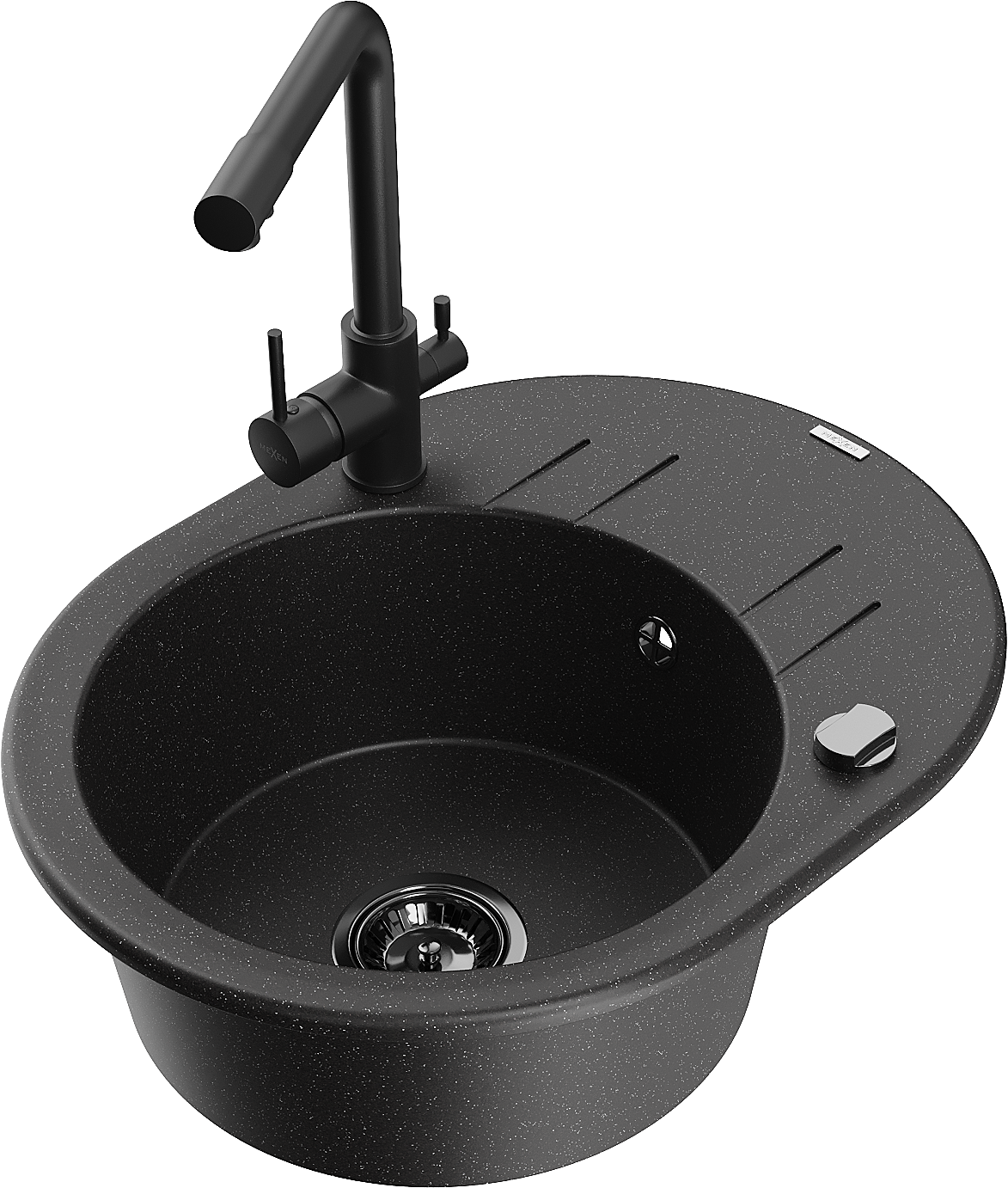 Mexen Kevin Granitový jednodrez s odkvapom a kuchynskou batériou Duero, čierny/strieborný metalický - 6517-73-671600-70-B