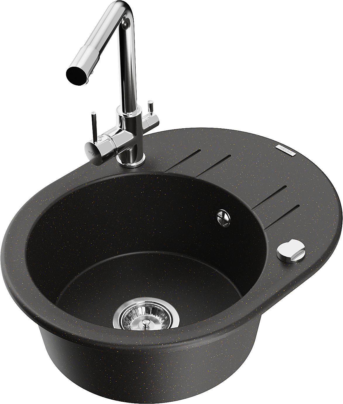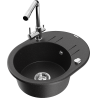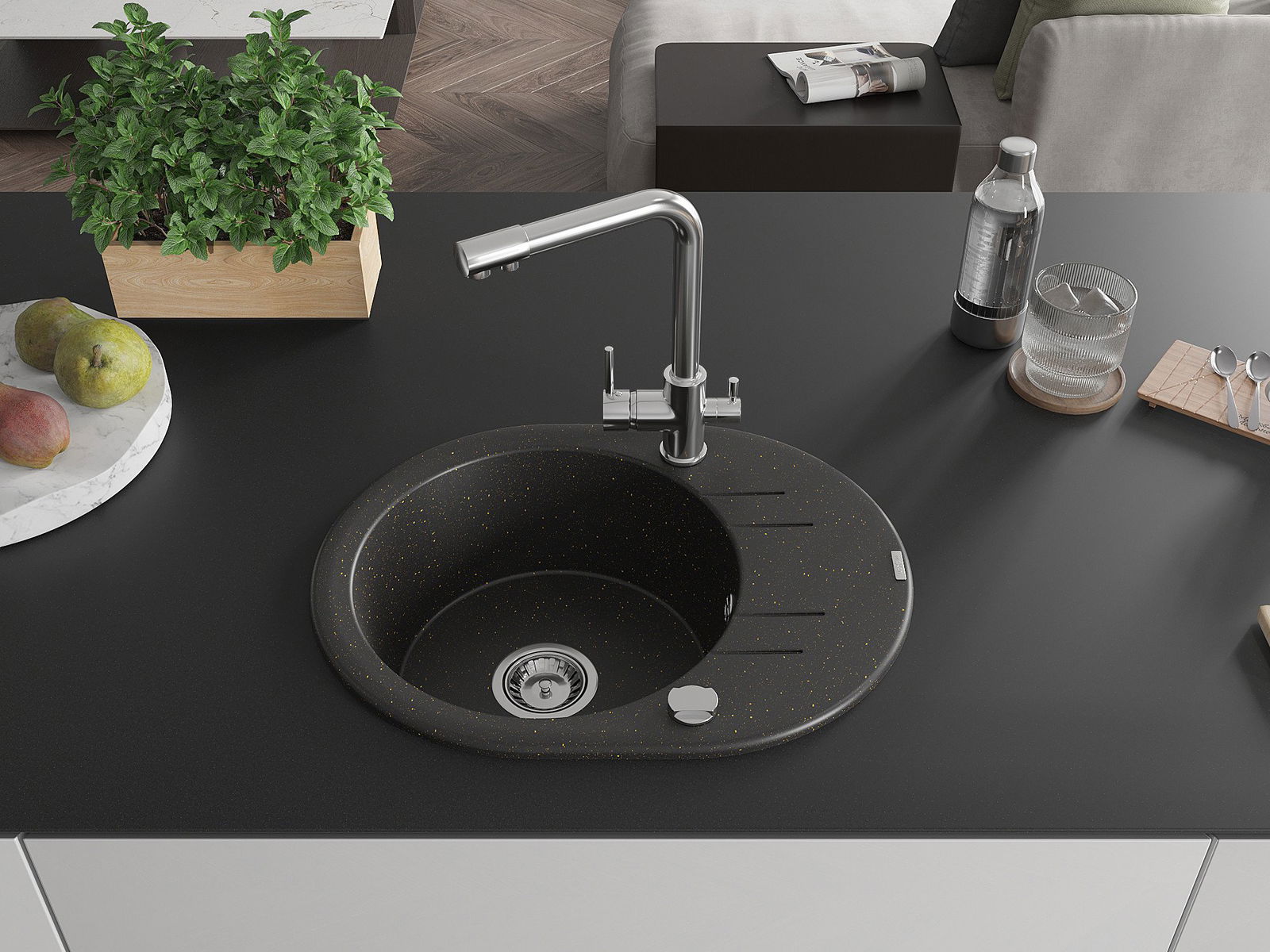 Mexen Kevin granitový drez s 1 komorou, odkvapkávačom a kuchynskou batériou Duero, čierny/zlatý metalik