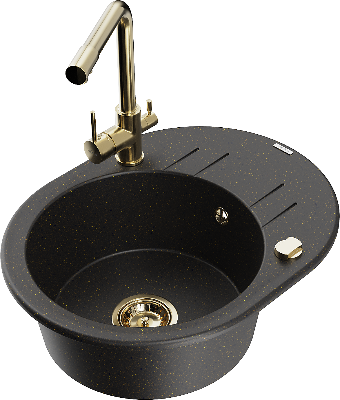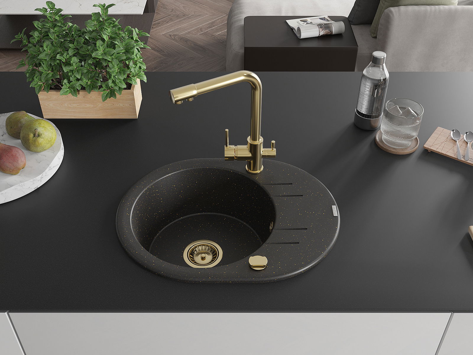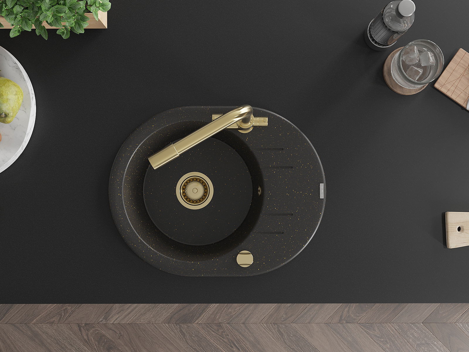 Mexen Kevin žulový drez s 1 komorou s odkvapkávačom a kuchynskou batériou Duero, čierny/zlatý metalik - 6517-75-671600-50