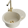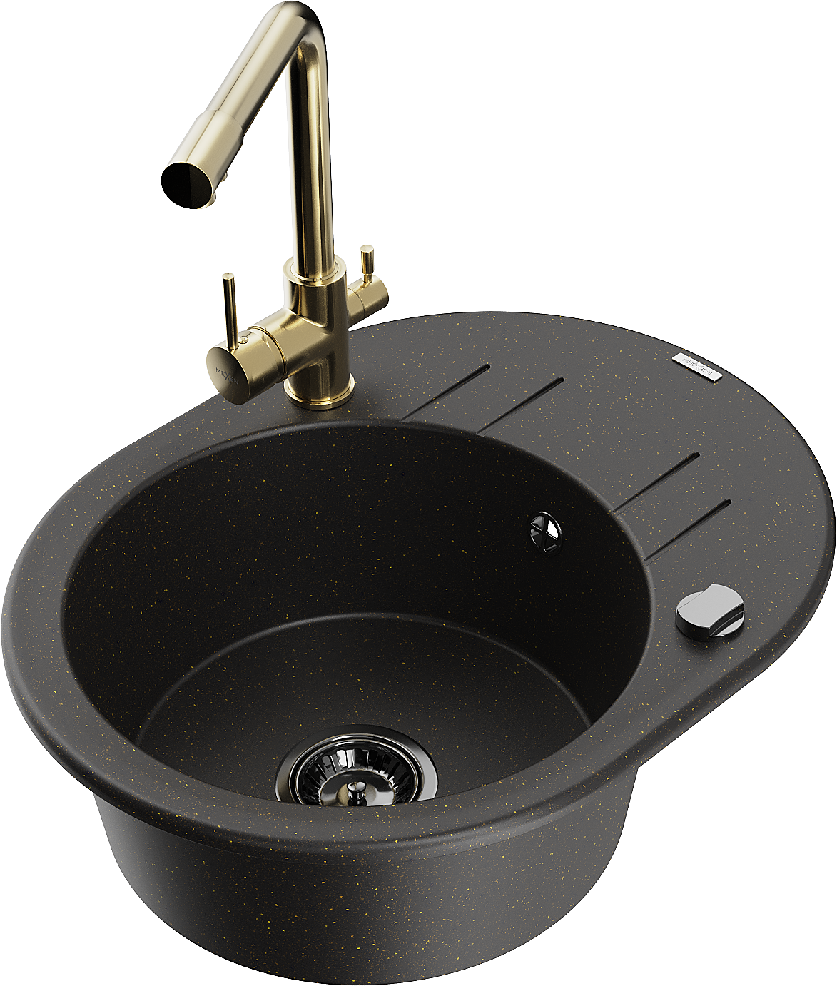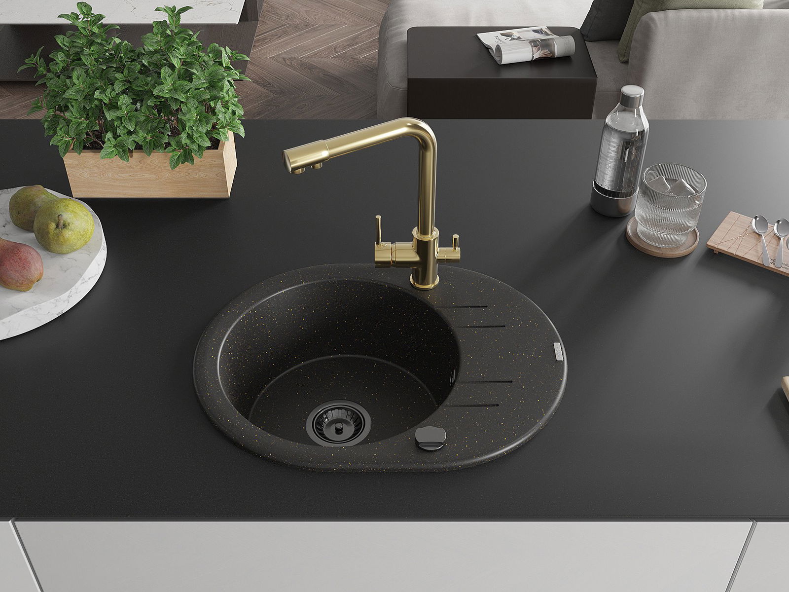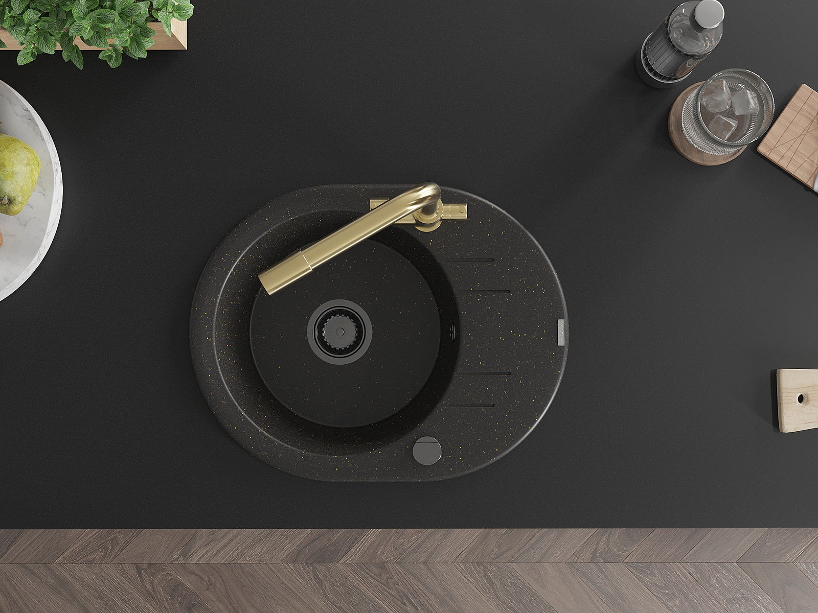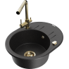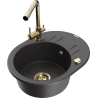 Mexen Kevin granitový drez 1-komorový s odkvapkávačom a kuchynskou batériou Duero, čierny/zlatý metalický