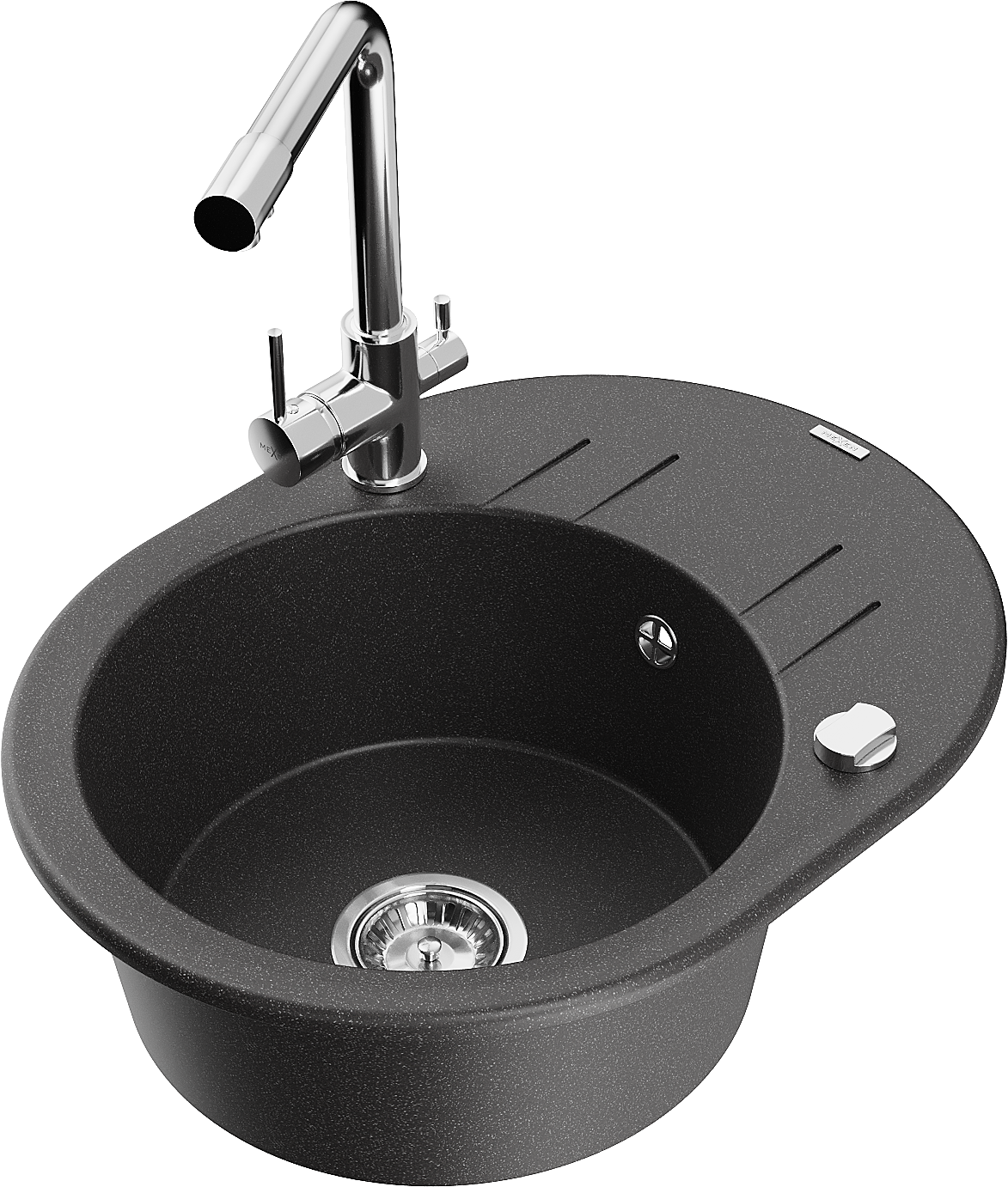 Mexen Kevin žulový drez s 1 komorou, odkvapkávacou plochou a kuchynskou batériou Duero, čierny s bodkami - 6517-76-671600-00