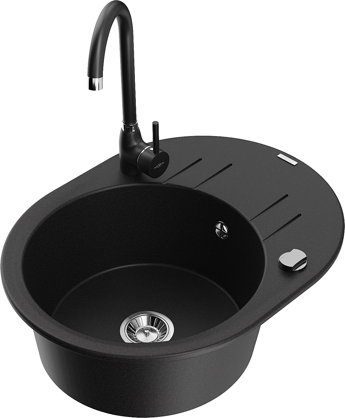 Mexen Kevin žulový drez 1-komorový s odkvapkávačom a kuchynskou batériou Telma, čierny - 6517-77-670200-70