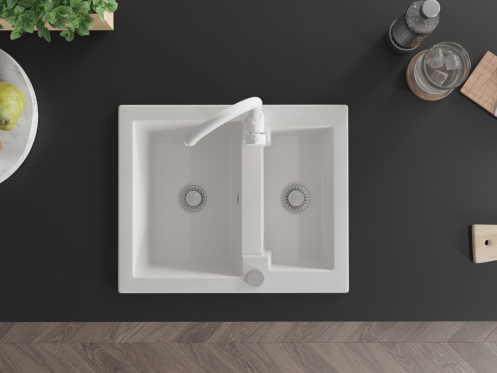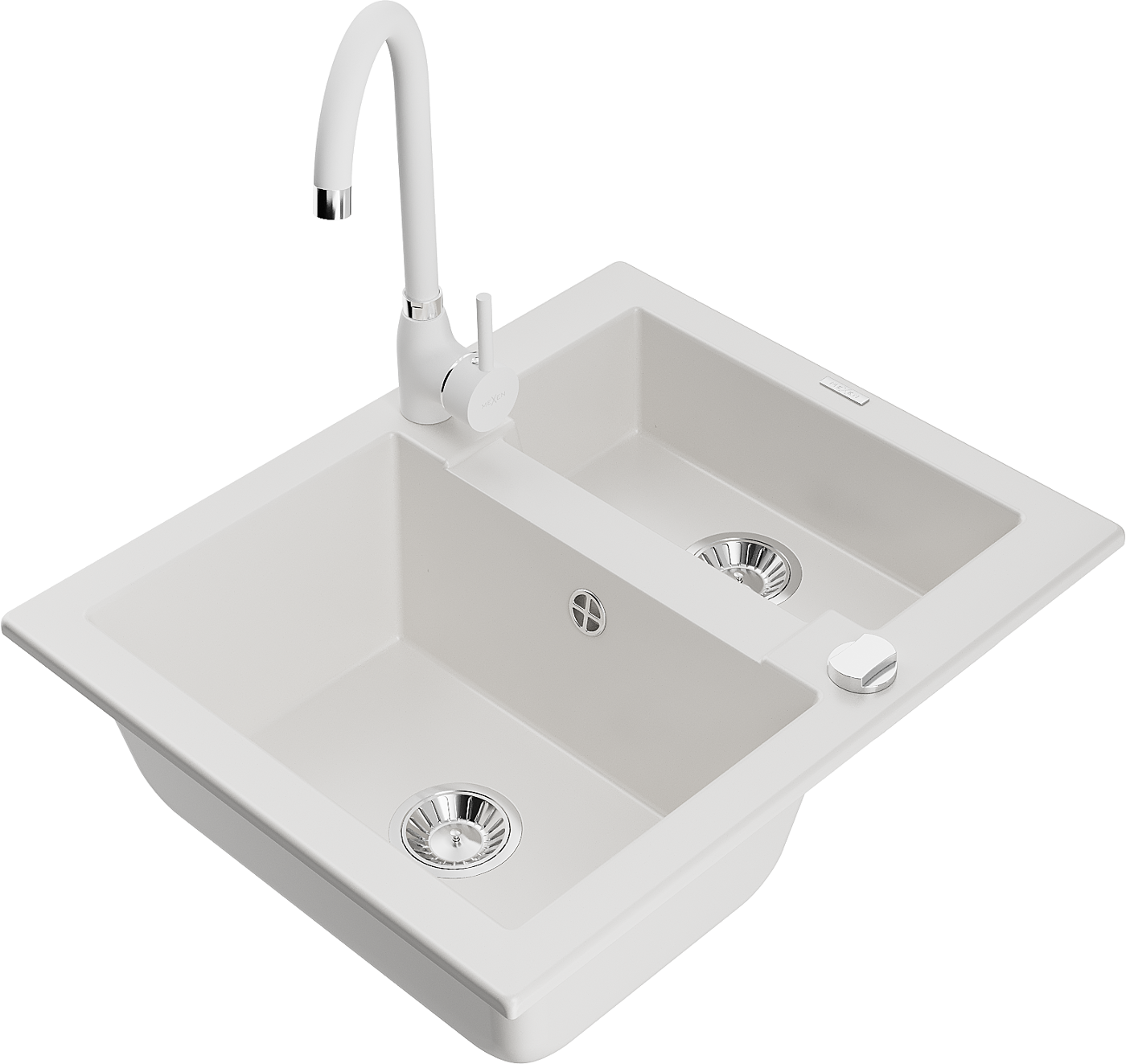 Mexen Carlos žulový drez 1,5-komorový s kuchynskou batériou Telma, biely - 6518-20-670200-20