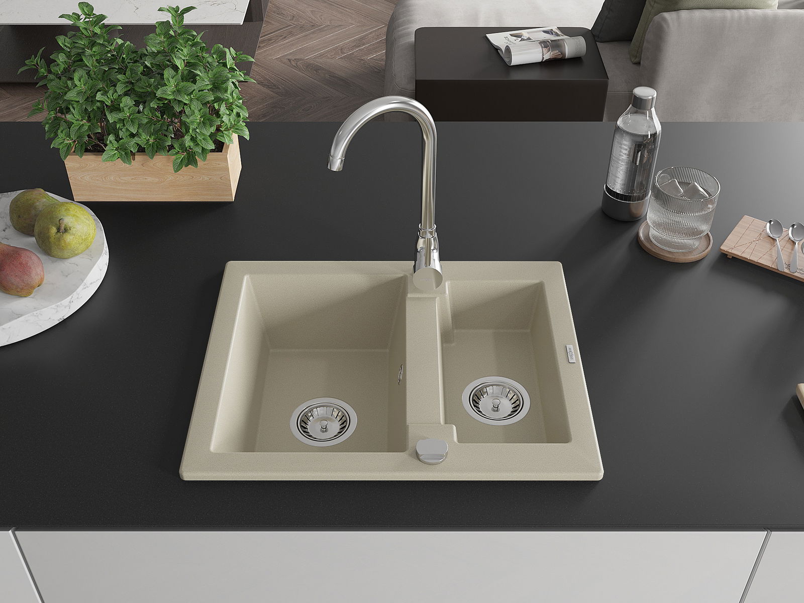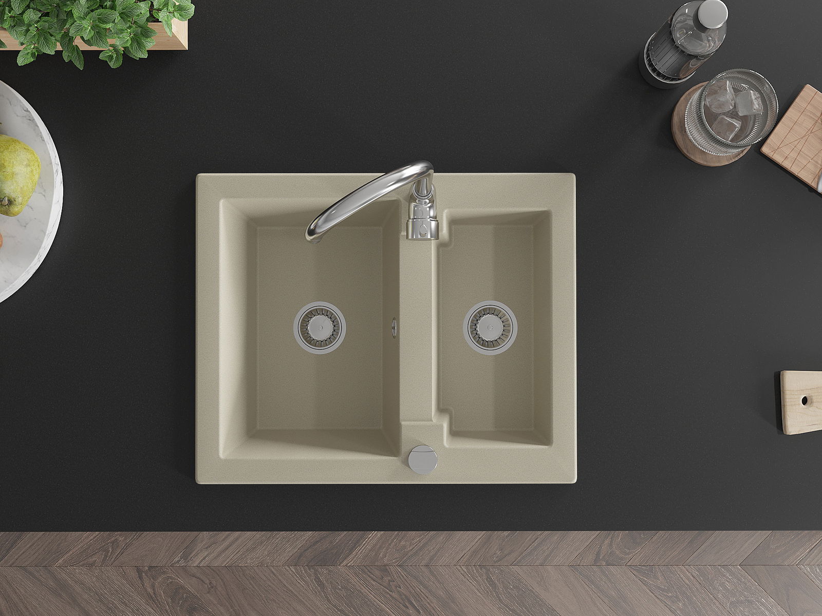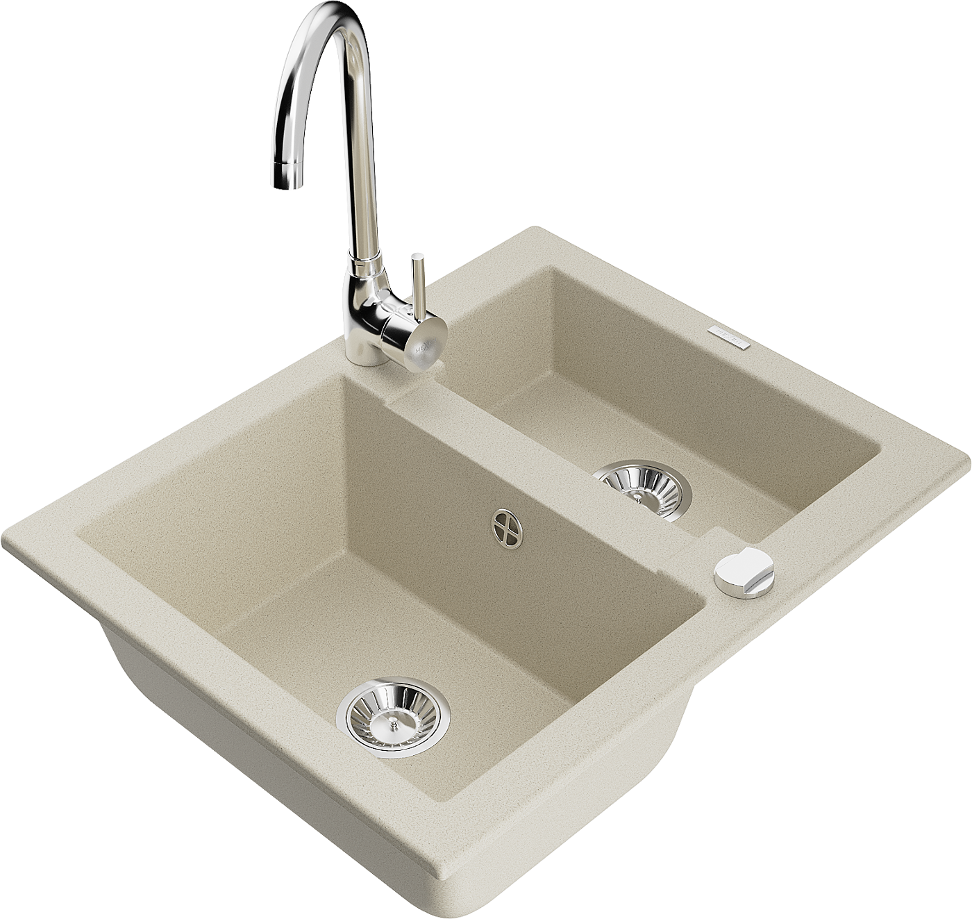 Mexen Carlos žulový kuchynský drez 1,5-komorový s kuchynskou batériou Telma, béžový - 6518-69-670200-00
