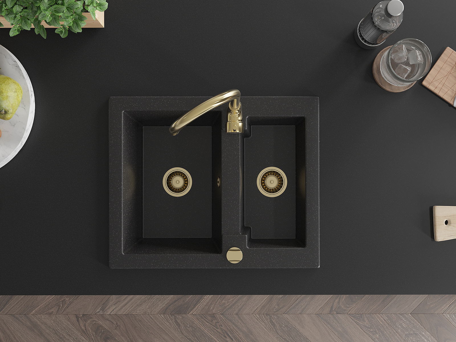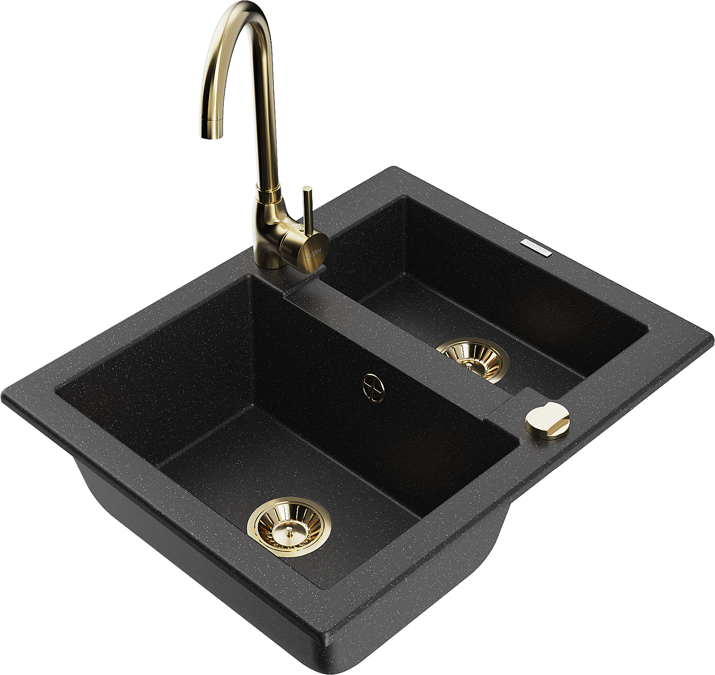 Mexen Carlos žulový drez 1,5-komorový s kuchynskou batériou Telma, čierny/strieborný metalik - 6518-73-670200-50