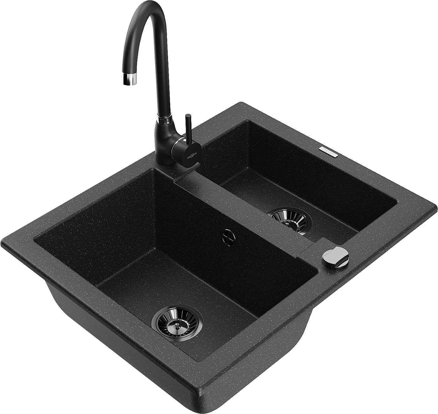 Mexen Carlos žulový drez 1,5-komorový s kuchynskou batériou Telma, čierny/strieborný metalický - 6518-73-670200-70-B