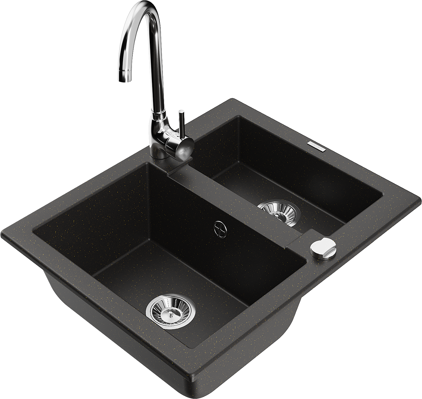 Mexen Carlos granitový drez 1,5-komorový s kuchynskou batériou Telma, čierna/zlatý metalik - 6518-75-670200-00