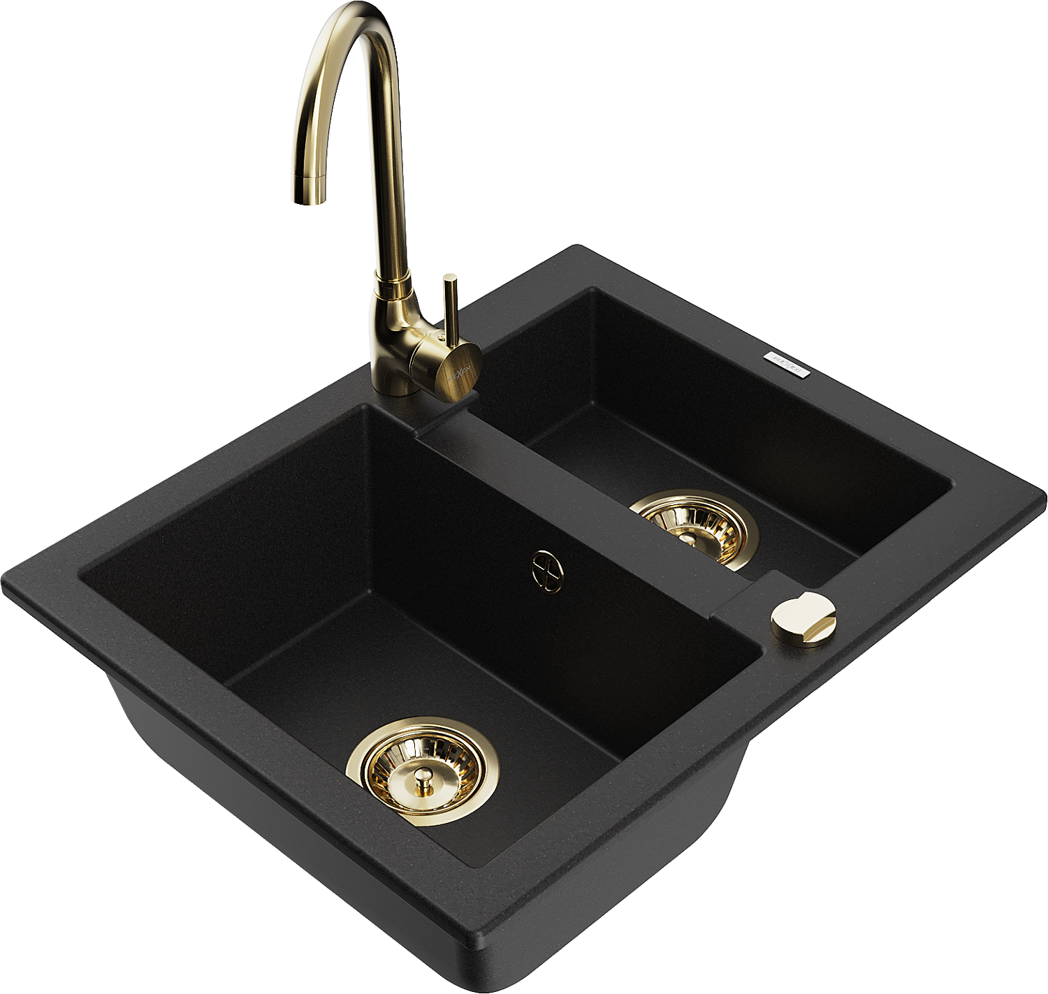 Mexen Carlos žulový drez 1,5-komorový s kuchynskou batériou Telma, čierny - 6518-77-670200-50