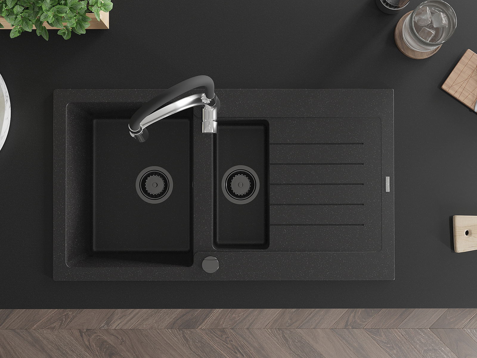 Mexen Matias granitový drez s 1,5 komorou a odkvapkávačom a kuchynskou batériou Aster, čierny/strieborný - 6502-73-73450-07-B