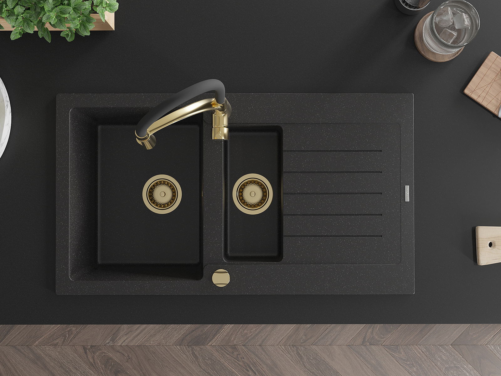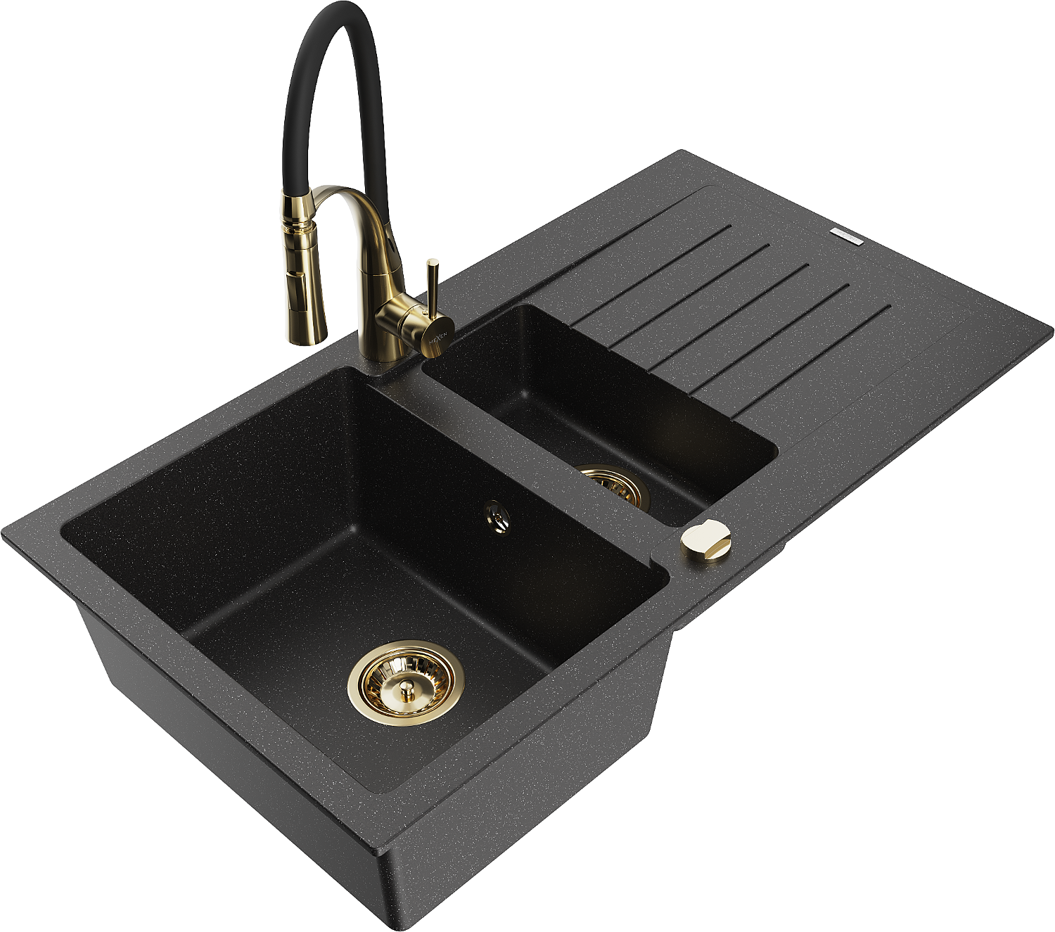Mexen Matias žulový drez 1,5-komorový s odkvapkávačom a kuchynskou batériou Aster, čierny/strieborný - 6502-73-73450-57-G