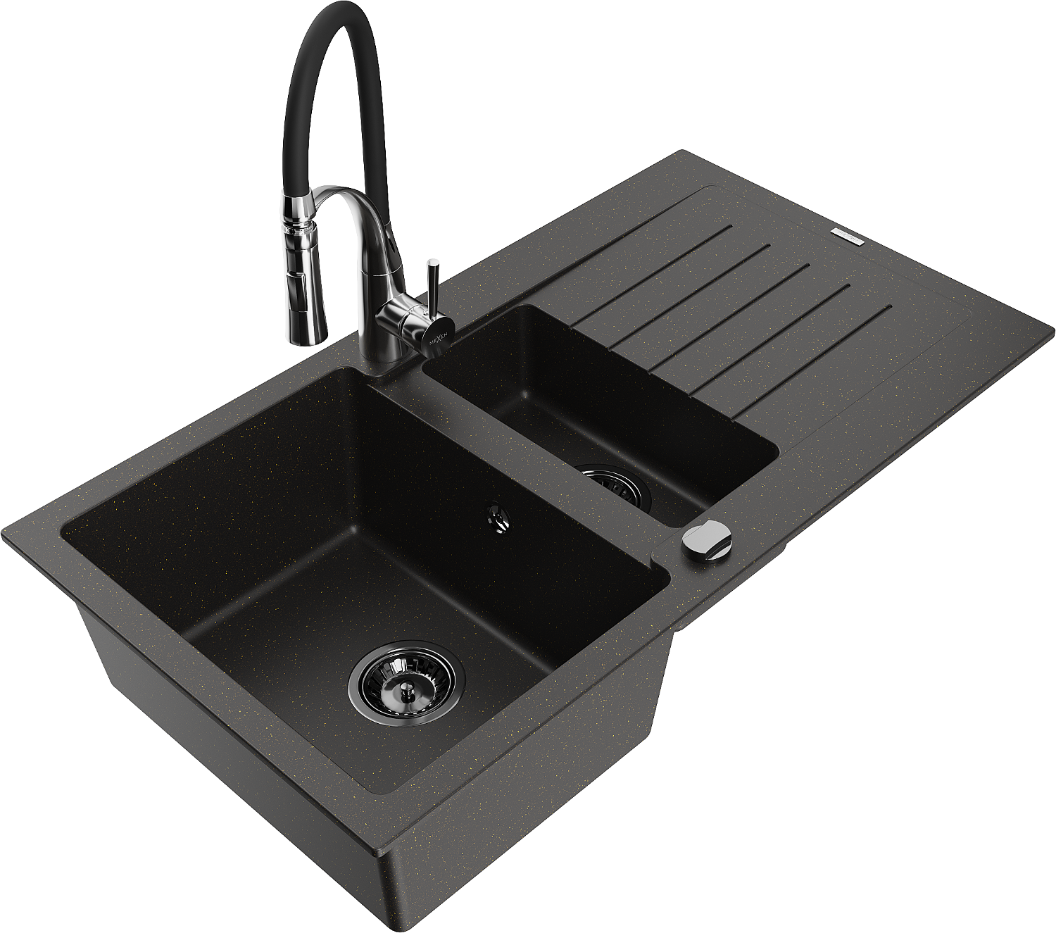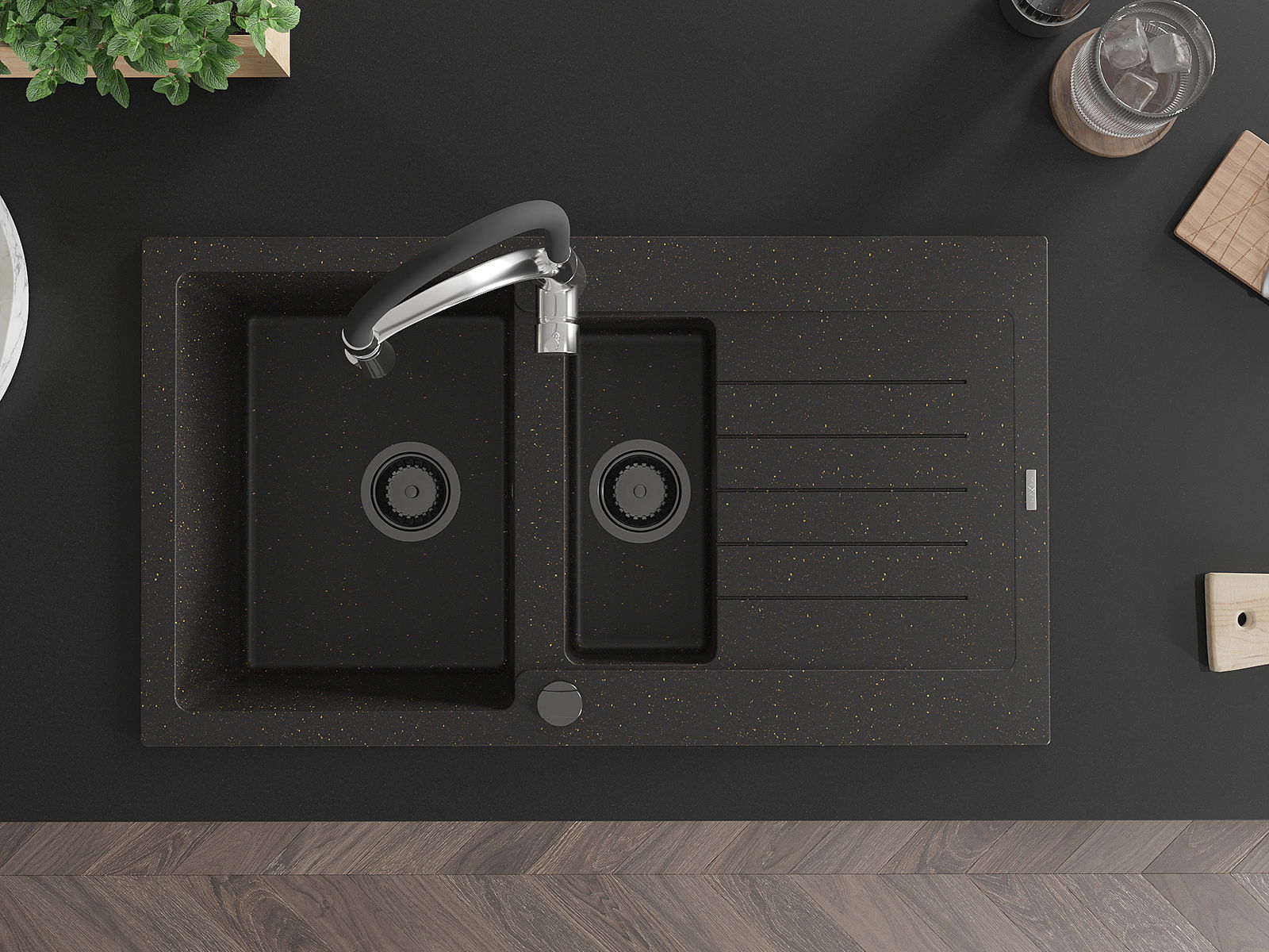 Mexen Matias granitový drez 1,5-komorový s odkvapkávačom a kuchynskou batériou Aster, čierny/zlatý metalik - 6502-75-73450-07-B