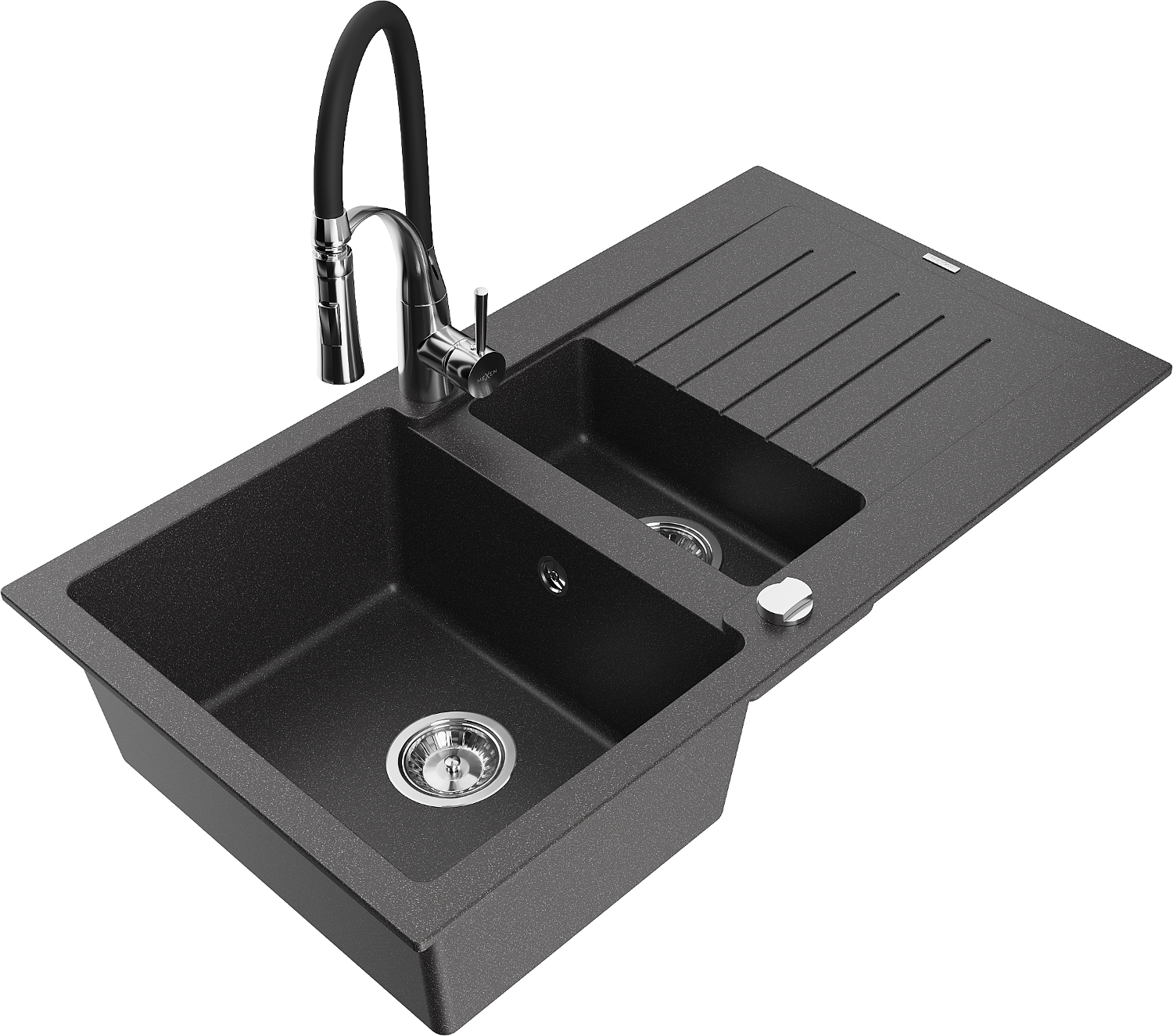 Mexen Matias granitový drez 1,5-komorový s odkvapkávačom a kuchynskou batériou Aster, čierny žíhaný - 6502-76-73450-07