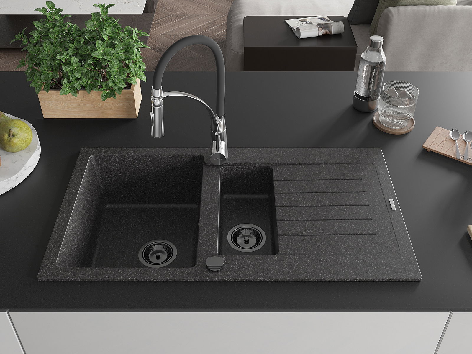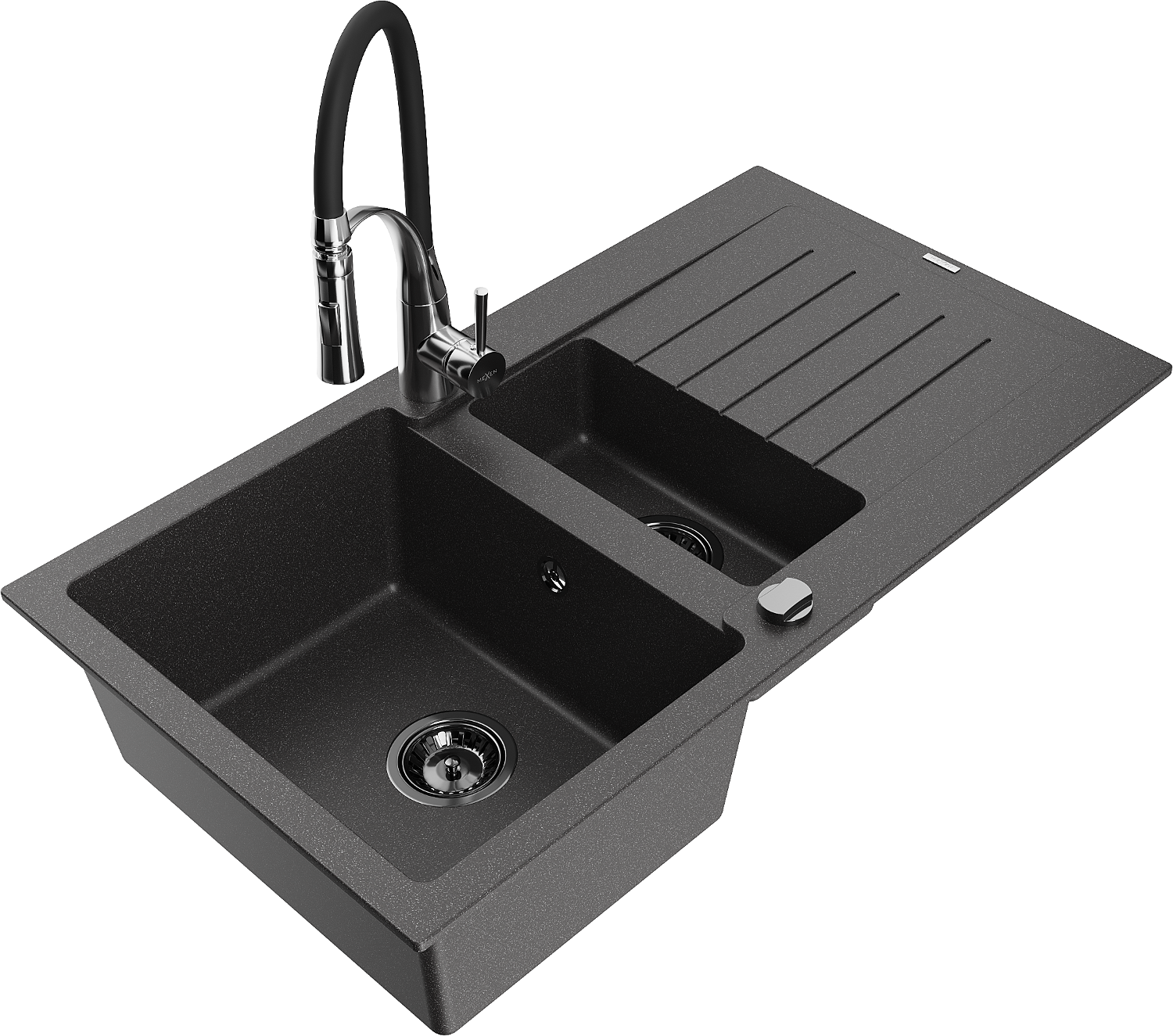 Mexen Matias granitový drez 1,5-komorový s odkvapávačom a kuchynskou batériou Aster, čierny škvrnitý - 6502-76-73450-07-B