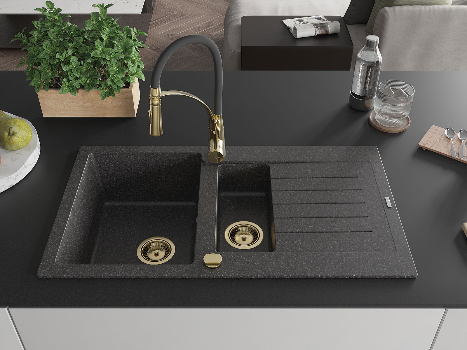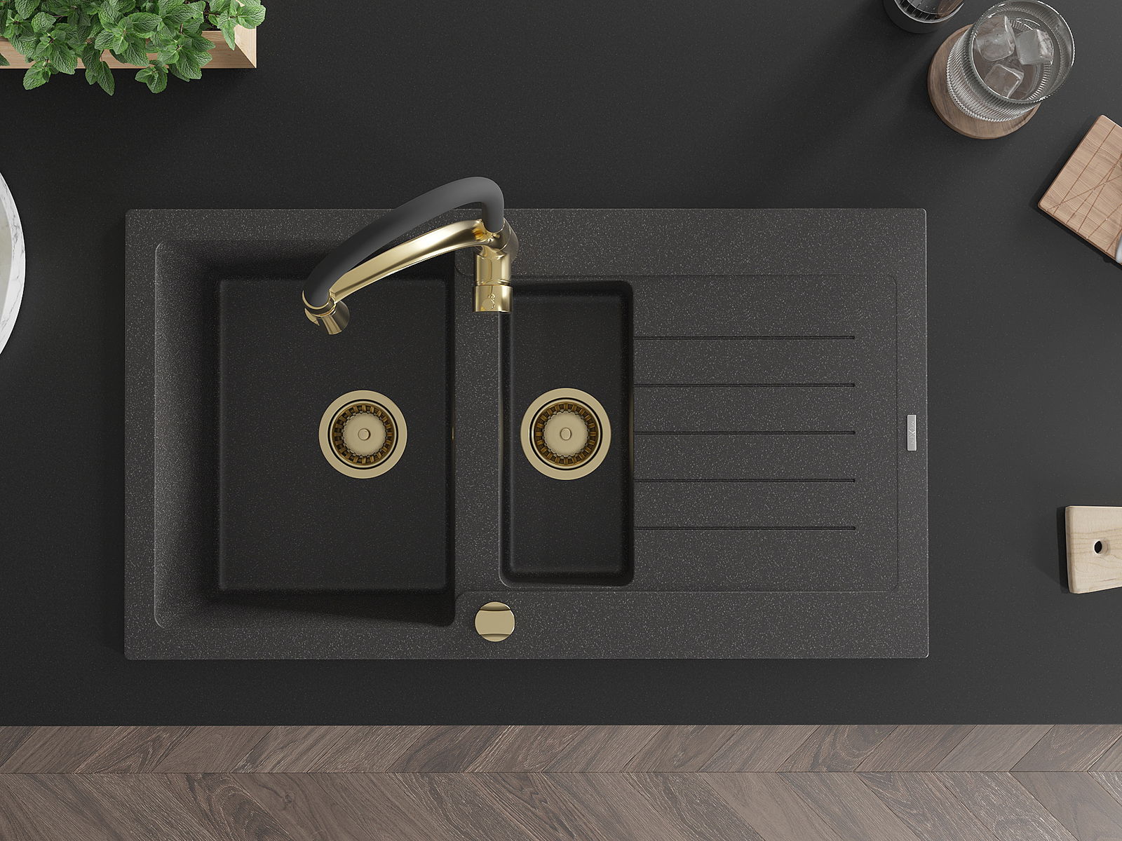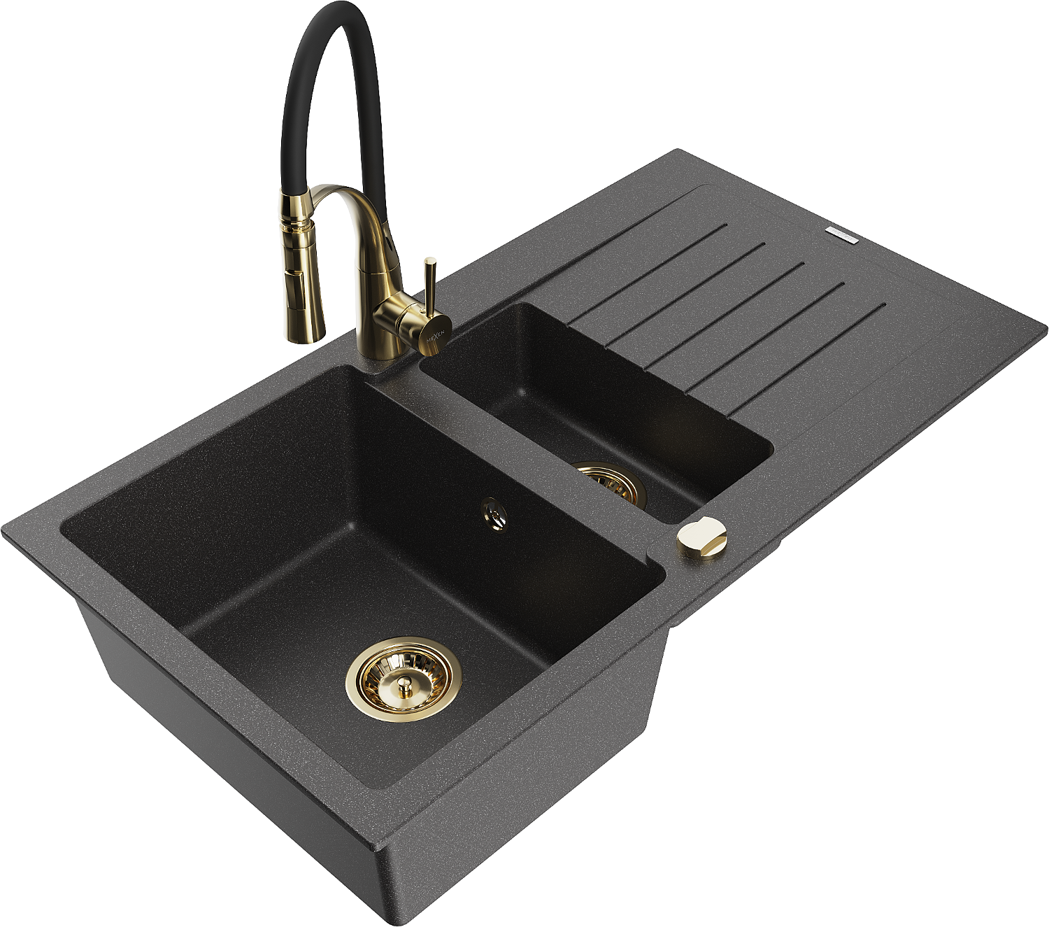 Mexen Matias granitový drez 1,5-komorový s odkvapkávačom a kuchynskou batériou Aster, čierny striekaný