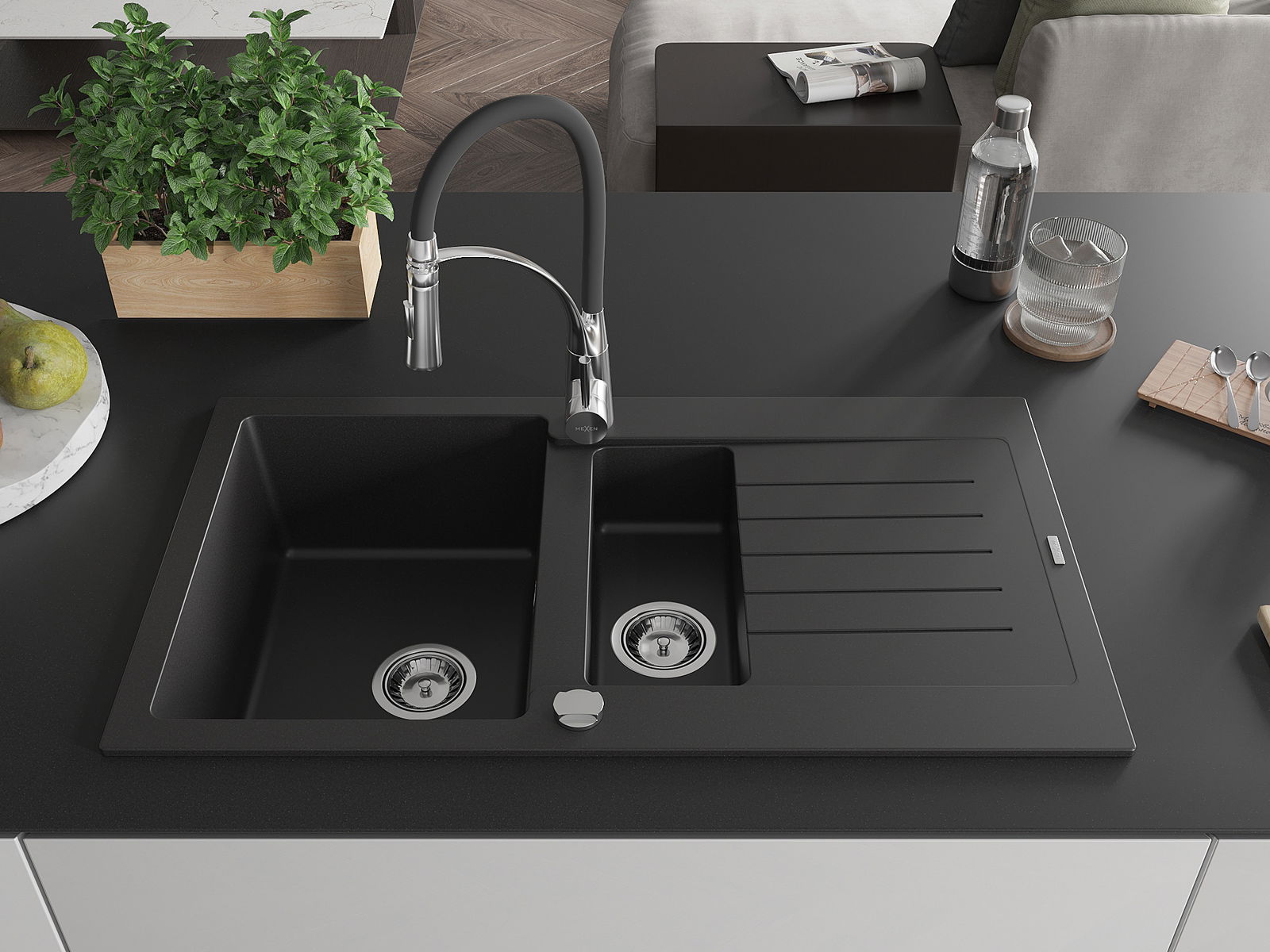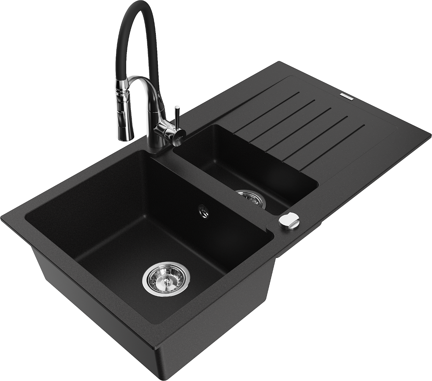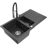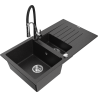 Mexen Matias granitový drez 1,5-komorový s odkvapkávačom a kuchynskou batériou Aster, čierny - 6502-77-73450-07