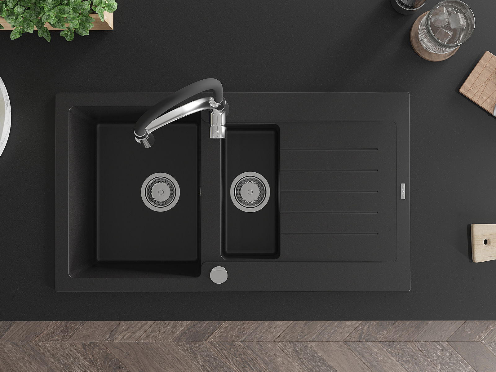 Povrch kuchynského drezu je odolný voči škvrnám a zafarbeniu, vďaka čomu sa ľahko udržiava a zachováva svoju farbu počas dlhého obdobia používania. Estetický a praktický doplnok pre každú kuchyňu.