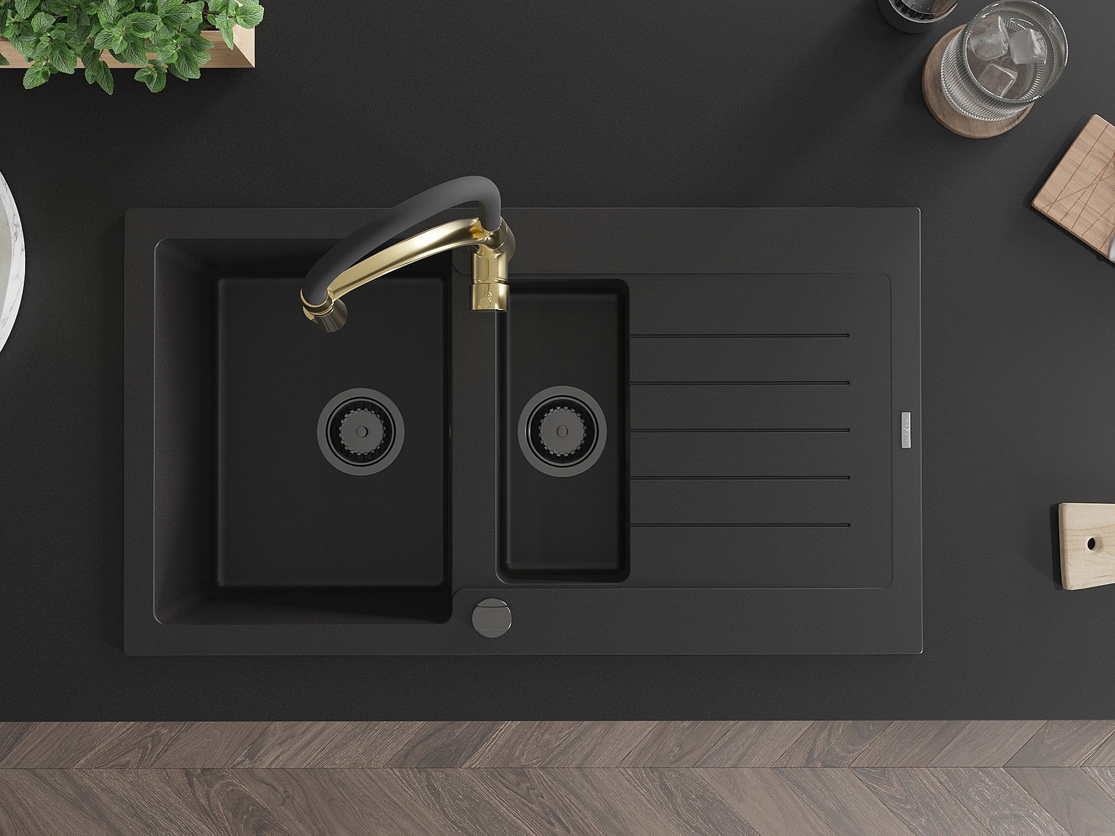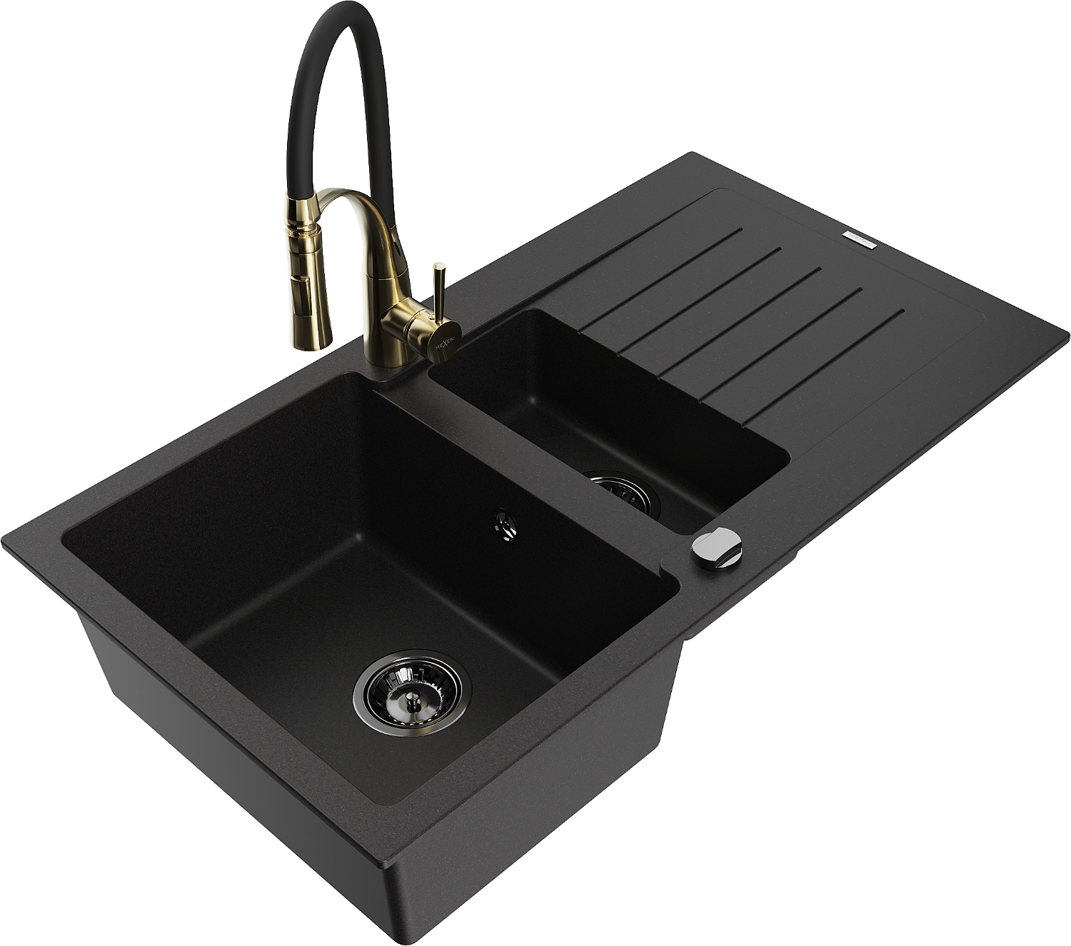 Mexen Matias granitový drez 1,5-komorový s odkvapkávačom a kuchynskou batériou Aster, čierny - 6502-77-73450-57-B