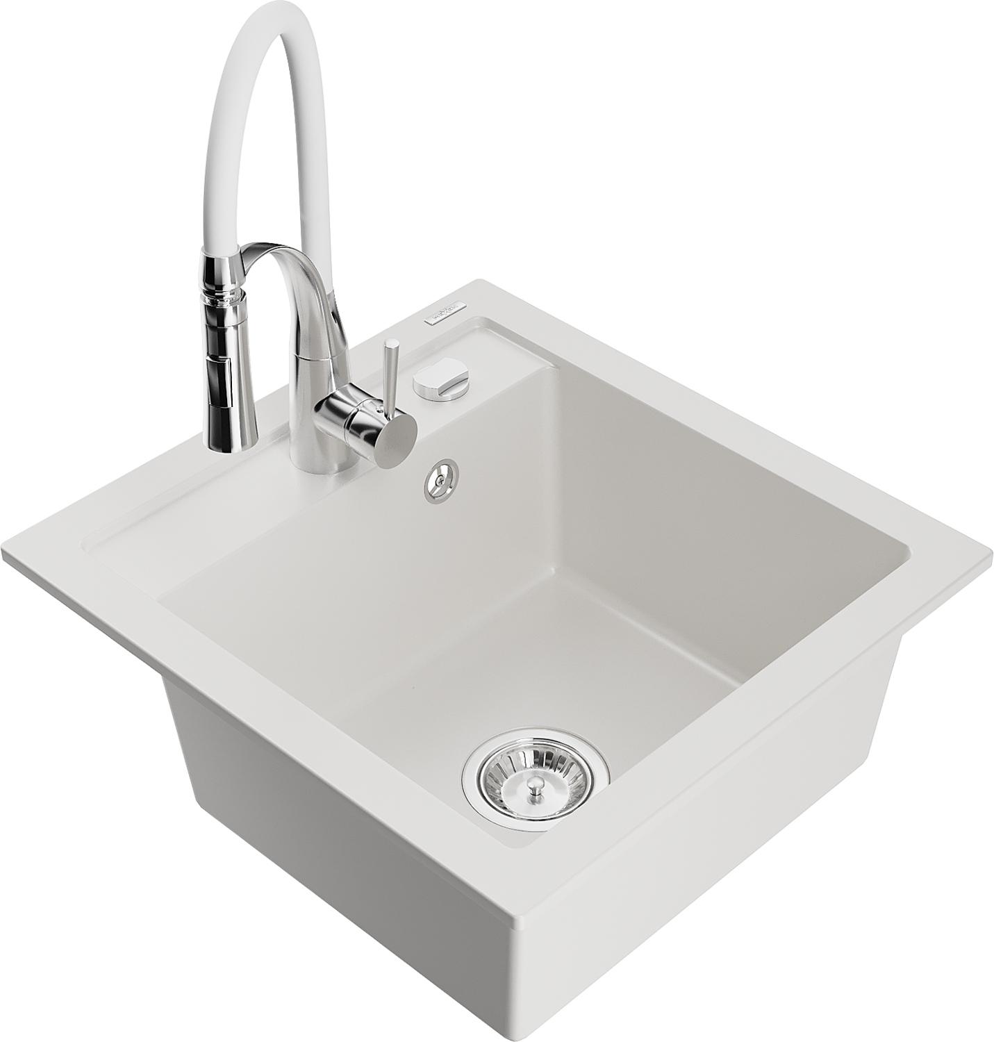Mexen Vito granitový kuchynský drez s 1 komorou s kuchynskou batériou Aster, biela - 6503-20-73450-02