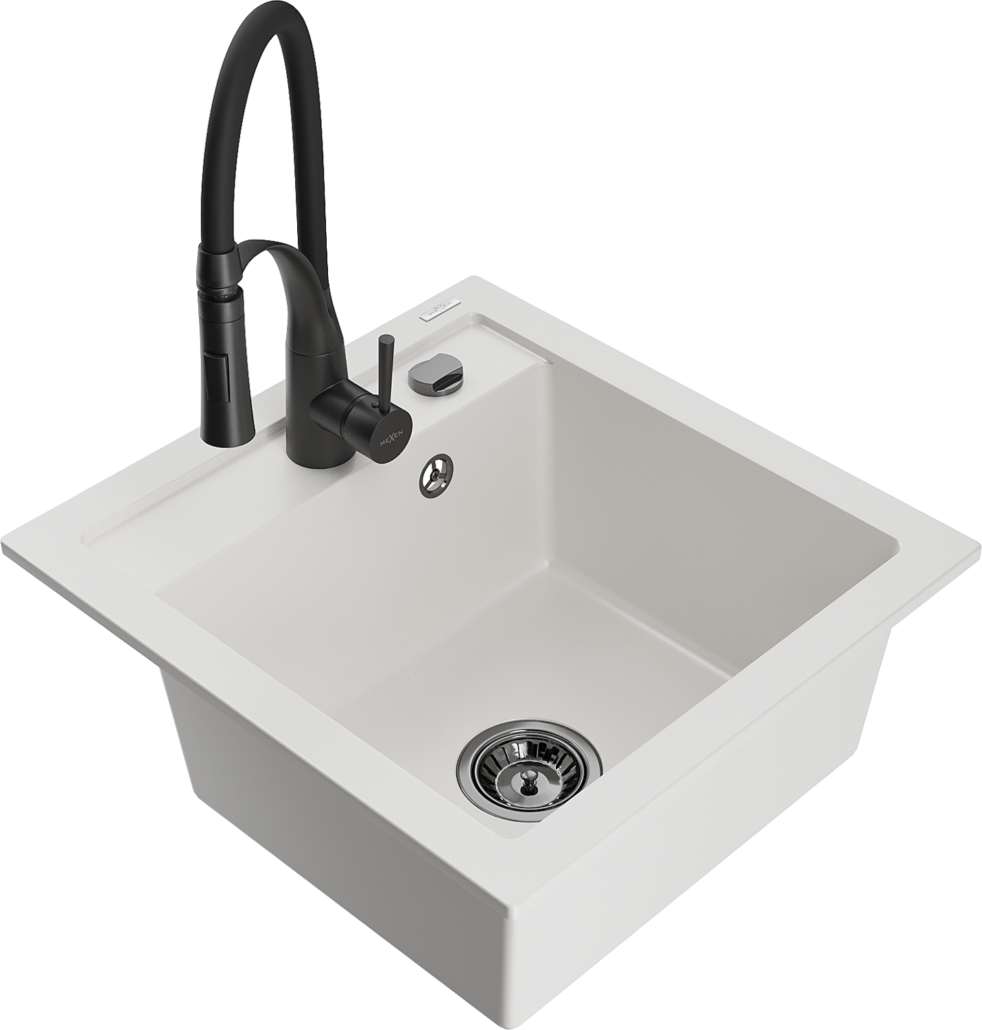 Mexen Vito granitový kuchynský drez 1-komorový s kuchynskou batériou Aster, biely - 6503-20-73450-70-B