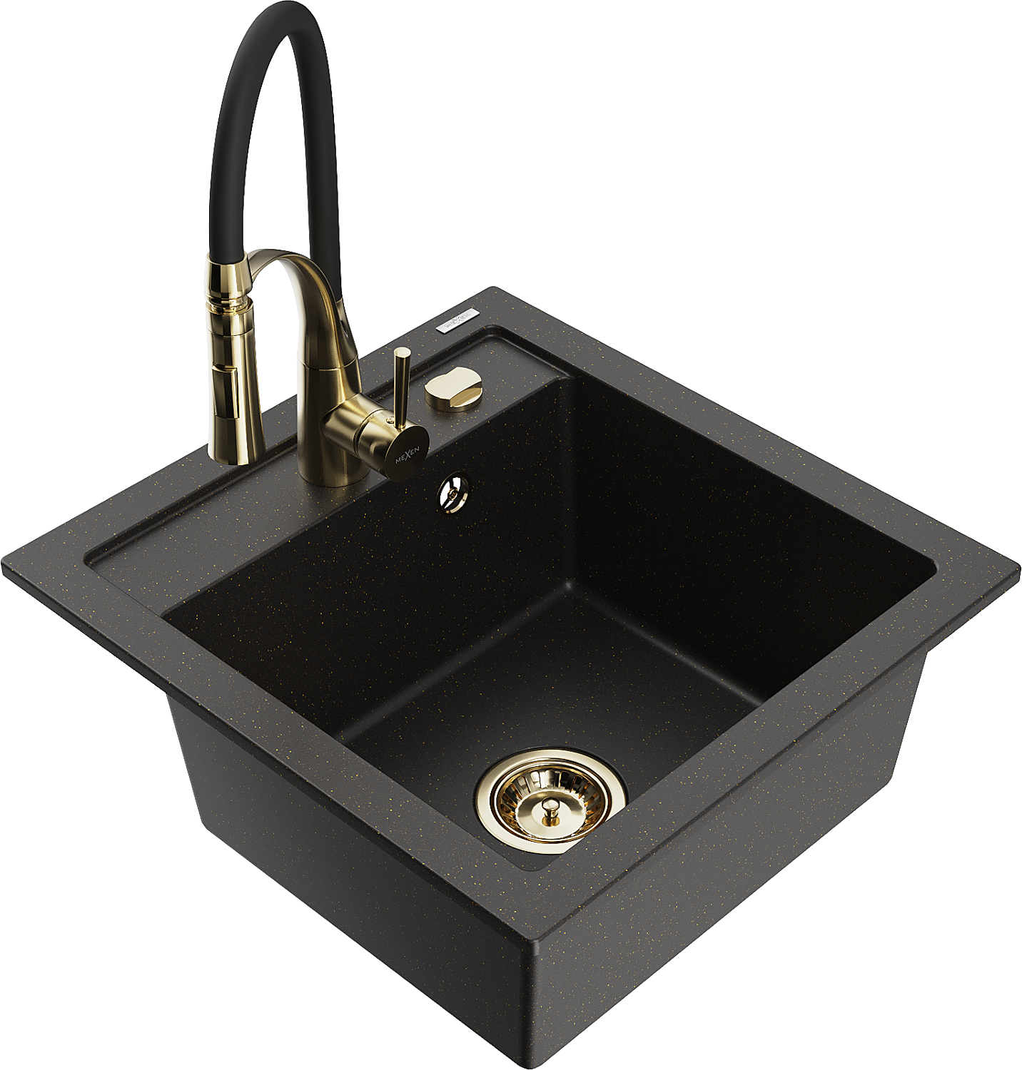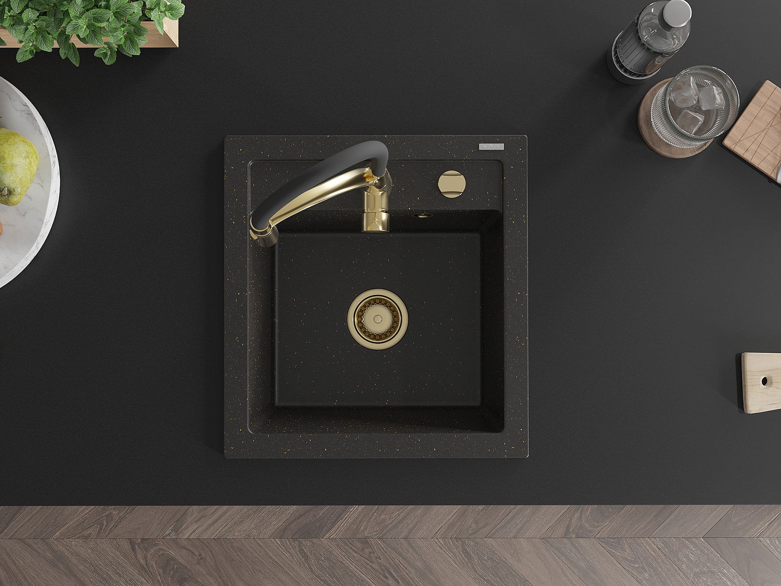 Mexen Vito granitový drez 1-komorový s kuchynskou batériou Aster, čierny/zlatý metalik- 6503-75-73450-57-G