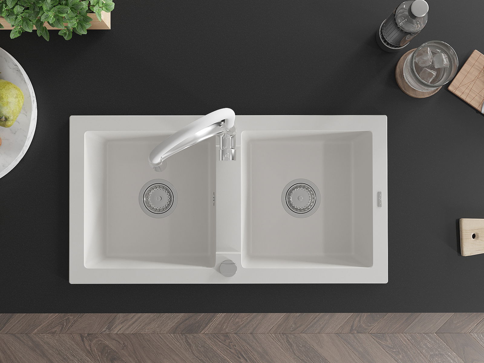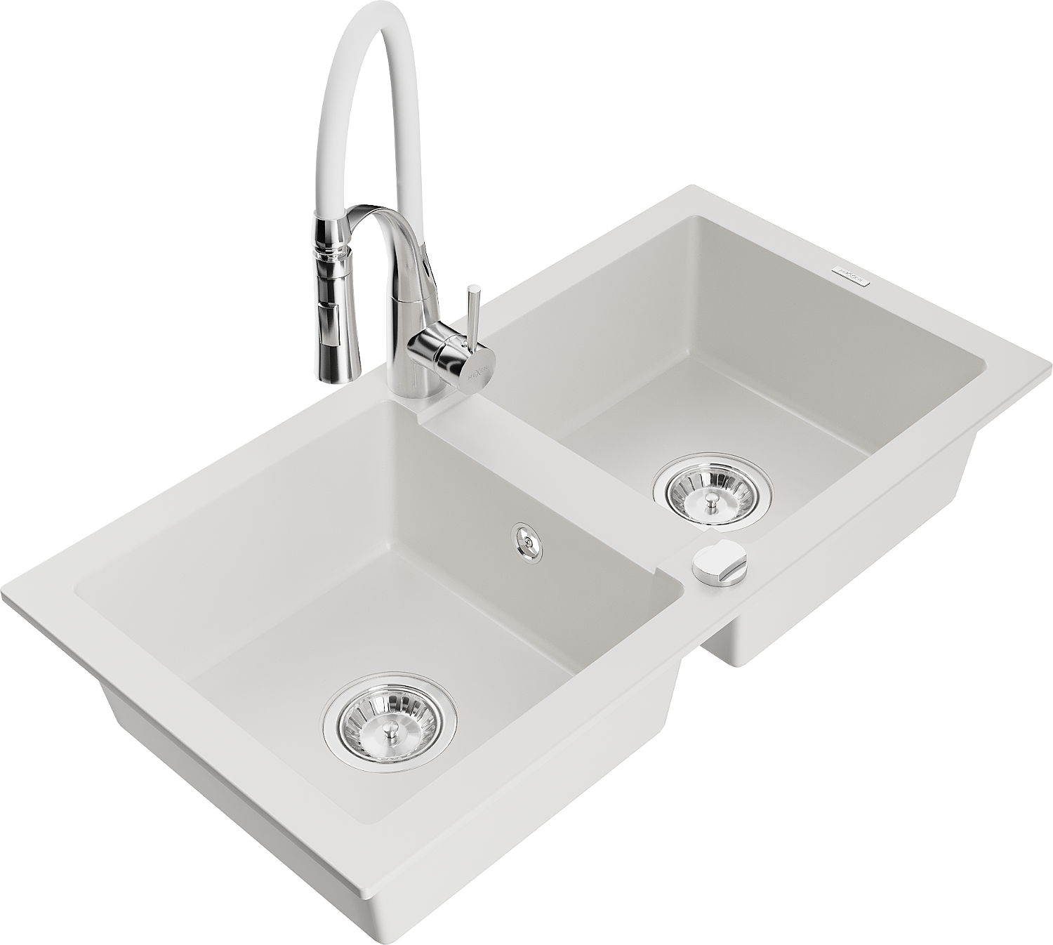 Mexen Mario žulový drez s 2-mi komorami a kuchynskou batériou Aster, biela - 6504-20-73450-02