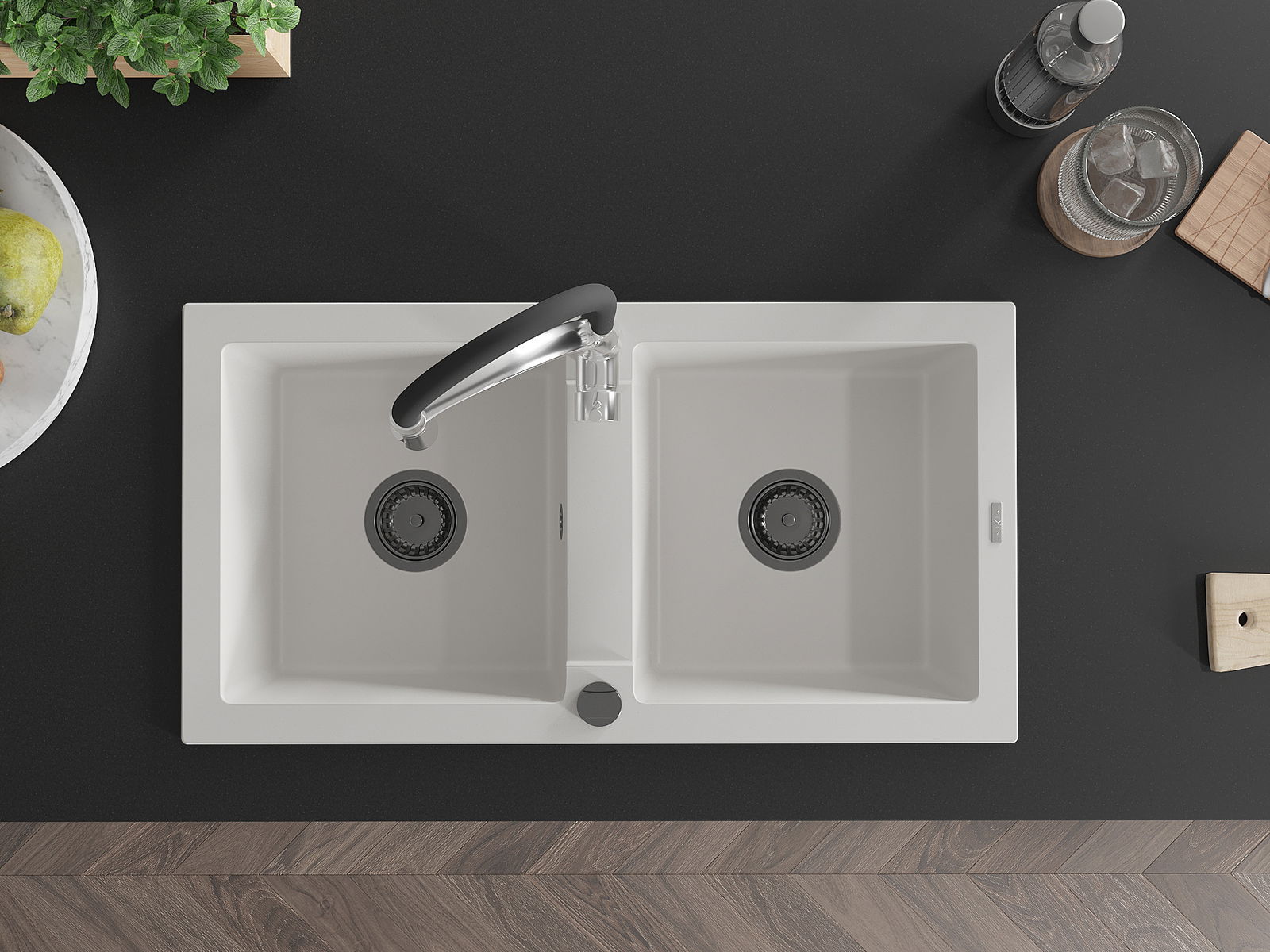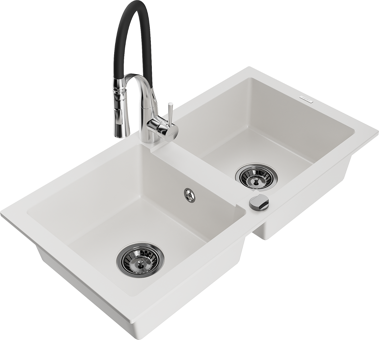 Mexen Mario granitový drez 2-komorový s kuchynskou batériou Aster, biely - 6504-20-73450-07-B