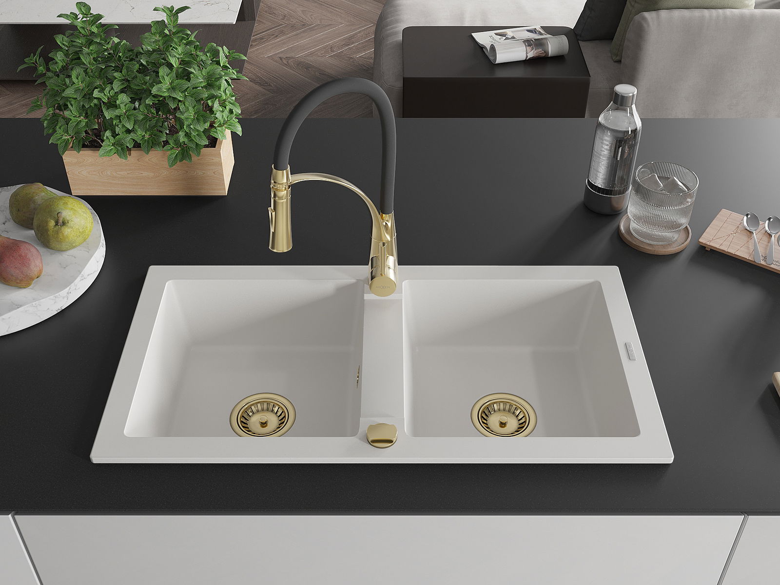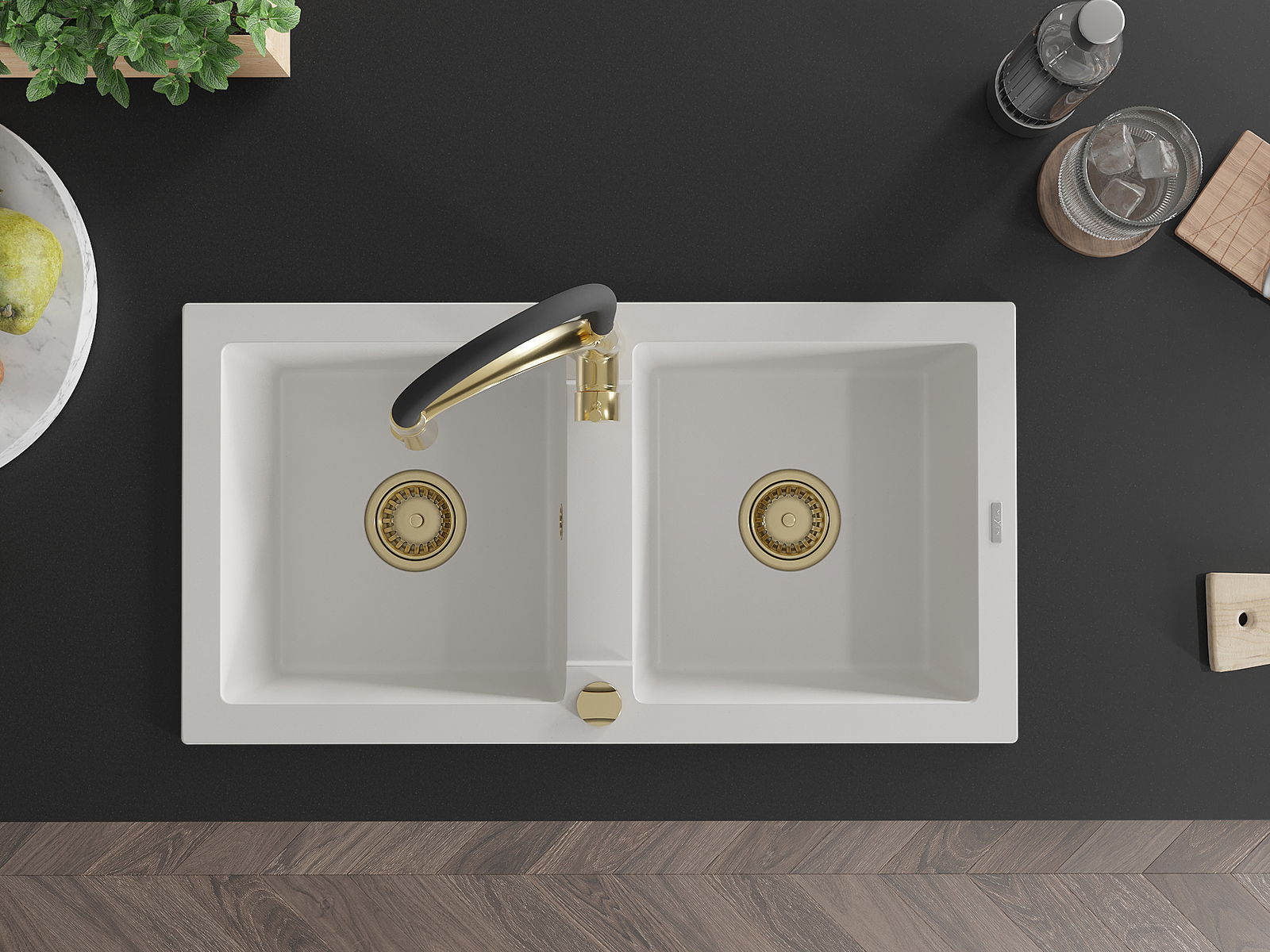 Mexen Mario žulový kuchynský drez 2-komorový s kuchynskou batériou Aster, biely - 6504-20-73450-57-G