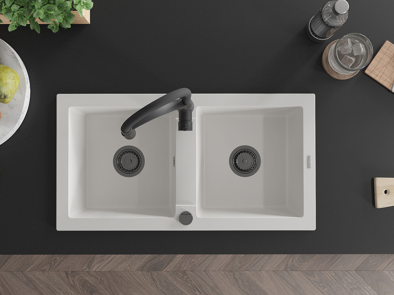 Mexen Mario granitový drez 2-komorový s kuchynskou batériou Aster, biely - 6504-20-73450-70-B