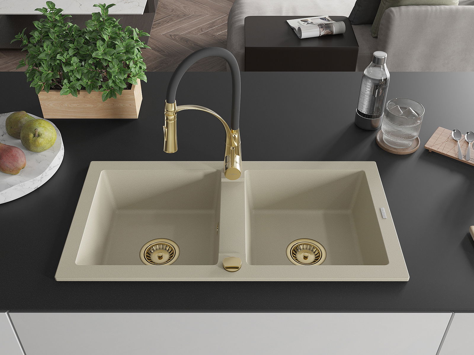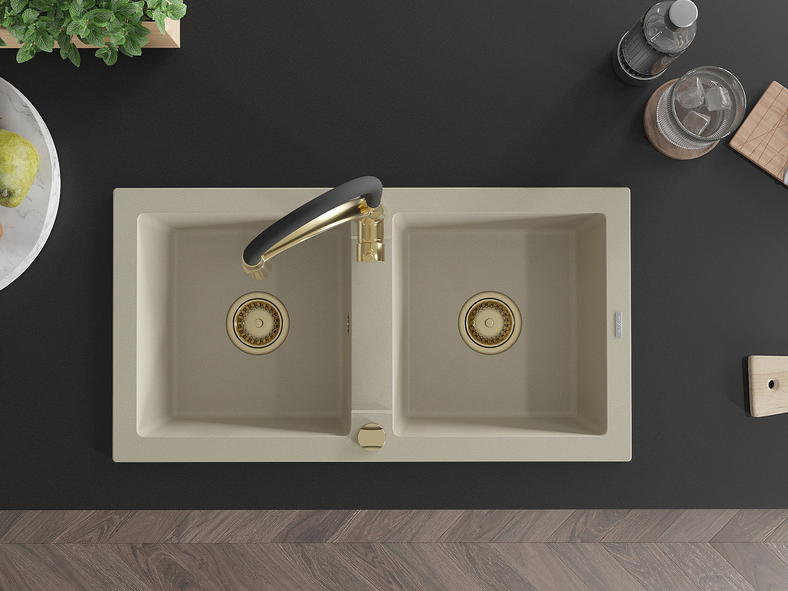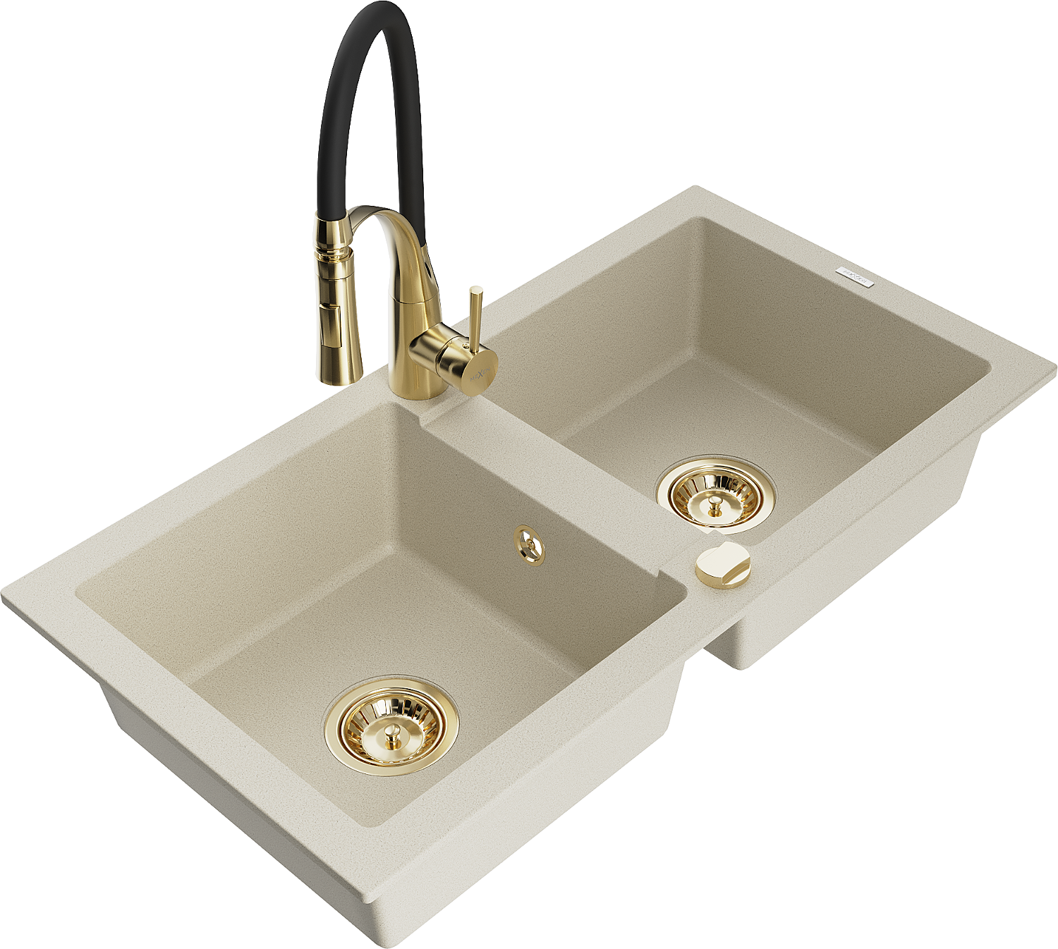 Mexen Mario dvojkomorový granitový drez s kuchynskou batériou Aster, béžový - 6504-69-73450-57-G