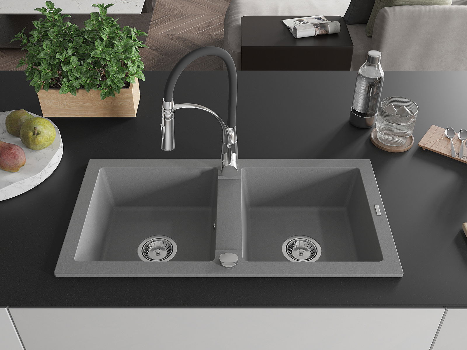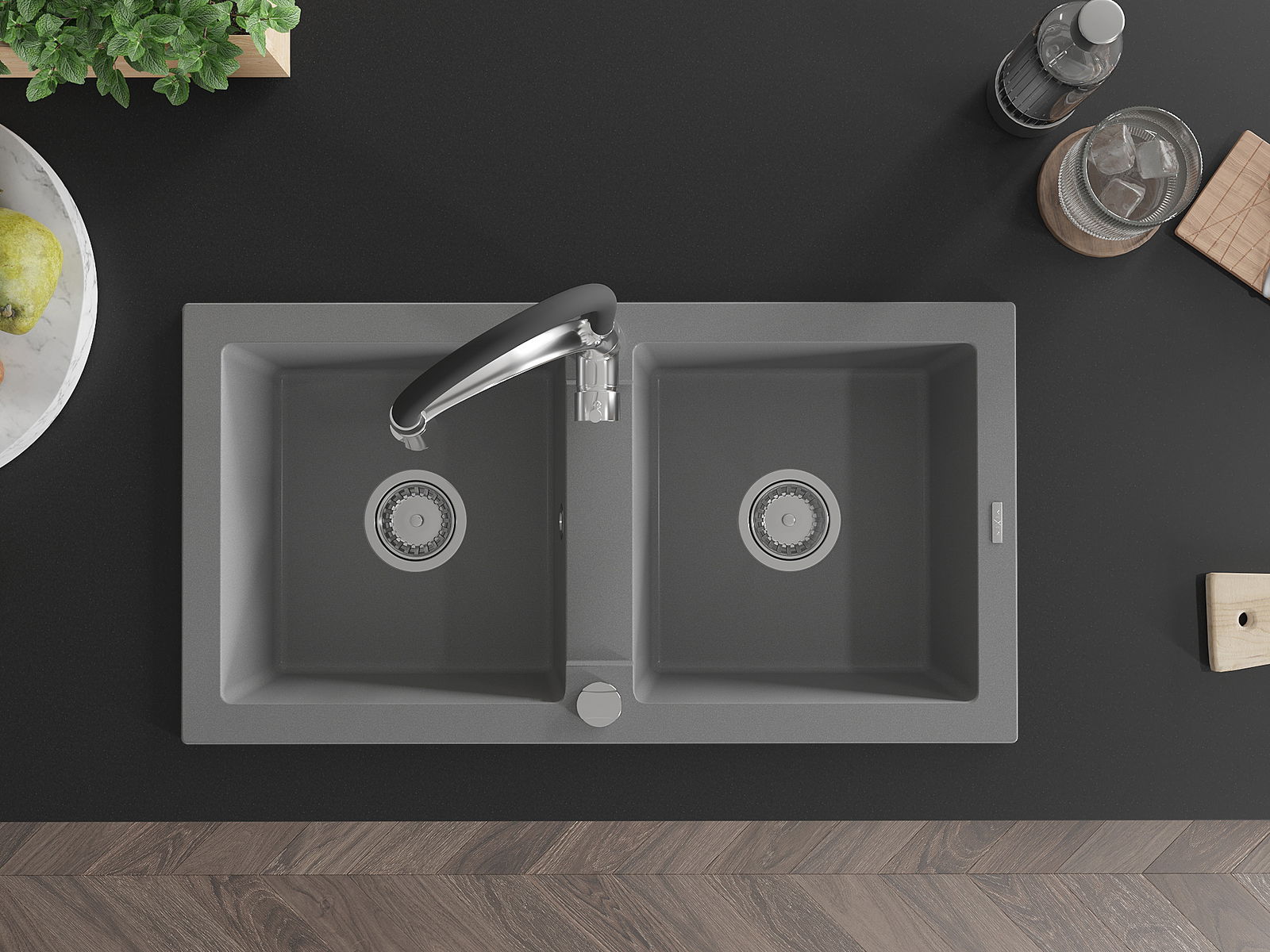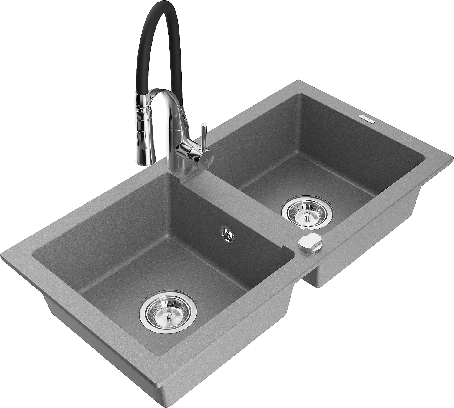 Mexen Mario dvojkomorový granitový drez s kuchynskou batériou Aster, sivý - 6504-71-73450-07